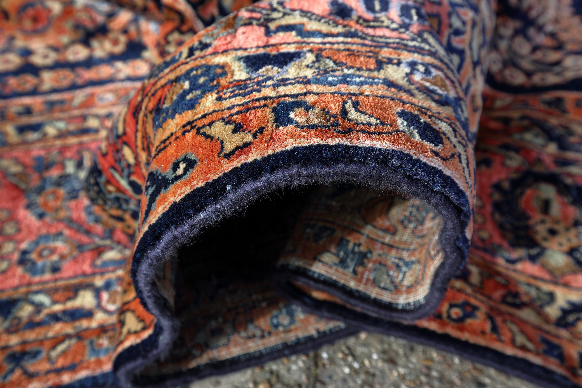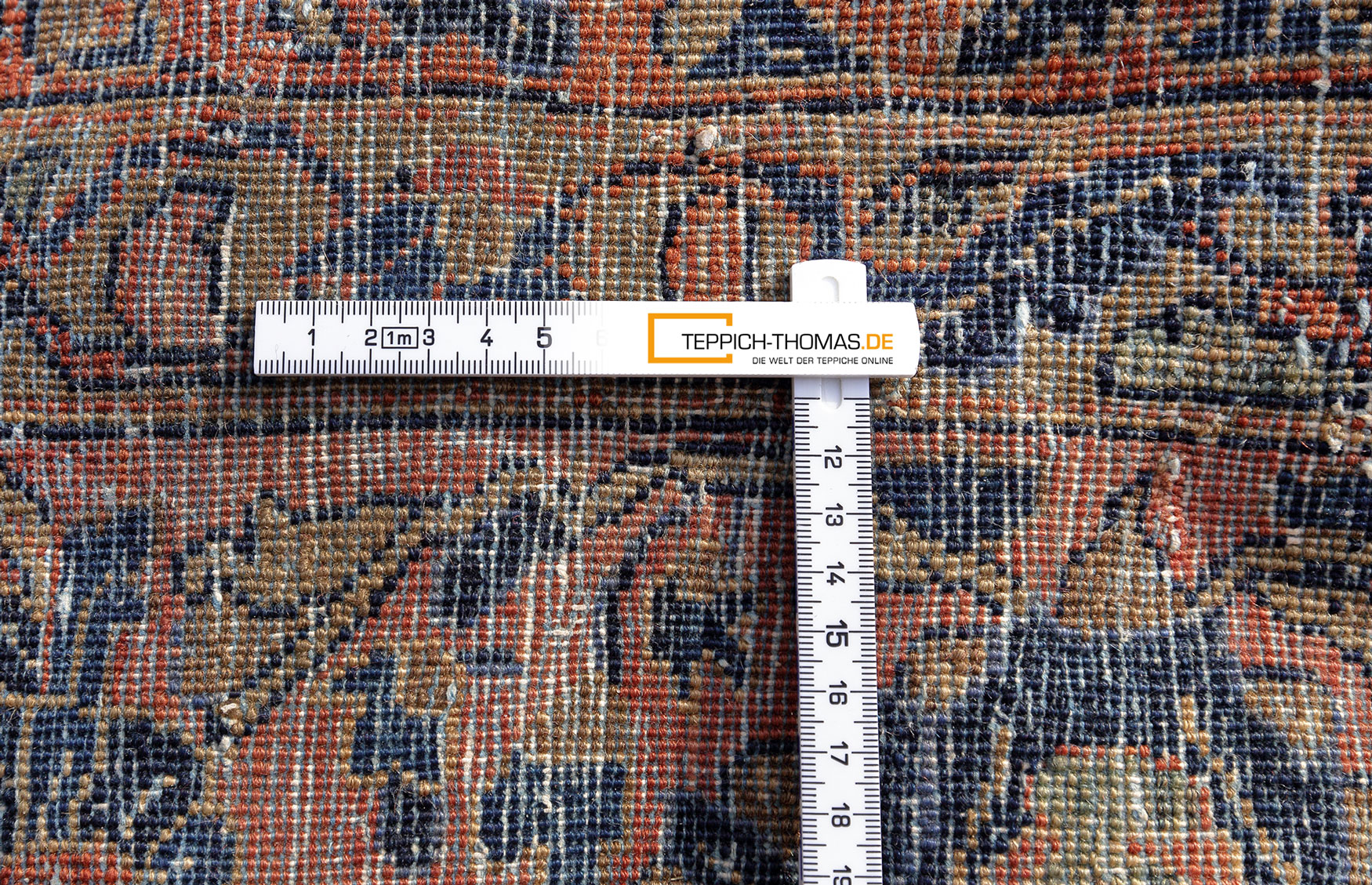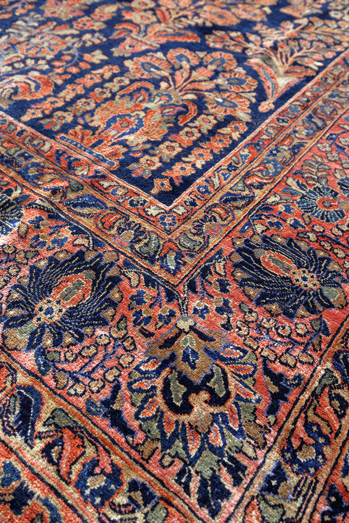 Mit viel Liebe zum Detail wurde dieser Sarough Perserteppich Anfang des letzten Jahrhunderts von Künstlern geknüpft. Im Zentrum des Teppichs finden wir ein Blumenkreuz mit Granatäpfeln, die man auch gerne als die „Paradiesäpfel“ bezeichnet. Großflächige Blütenformen wechseln sich mit floralem Rankewerk ab. Man glaubt in einem Blumengarten zu wandeln. Die Färber und Wäscher haben bei diesem seltenen und wirklich schönen Stück eine ganz besonders glückliche Hand gehabt. Eine großartige Arbeit, in der das ganze Kunstempfinden des Sarough-Gebietes zum Ausdruck kommt.