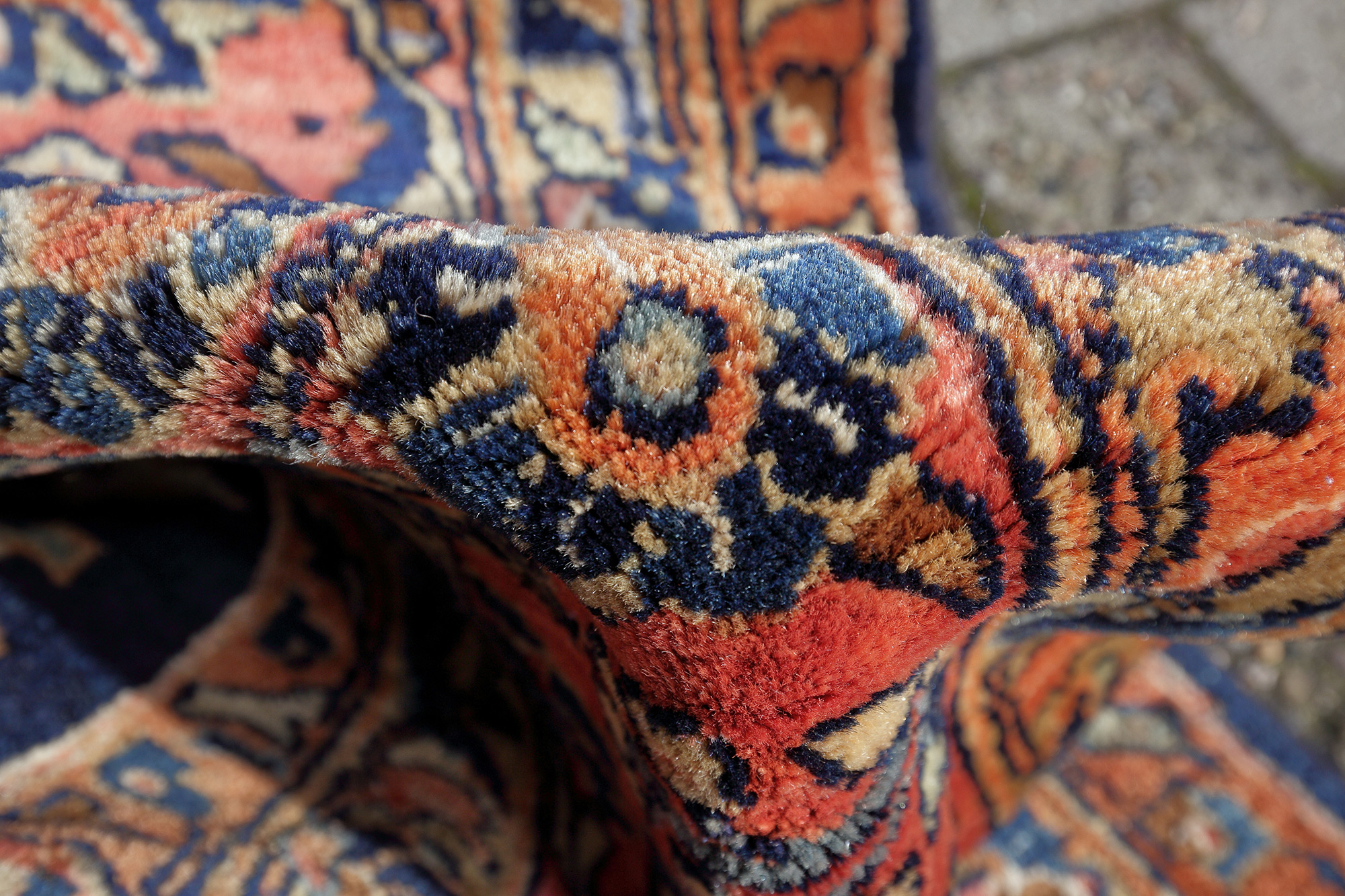 Die Schönheit der Farben in verschiedenen Abstufungen, die elegante meist florale Zeichnung und die feste Struktur haben die Saruk-Teppiche im Laufe des 20. Jh. Zum meistexportierten Teppich nach Europa und vor allem in die USA gemacht. Das hier vorliegende Stück gehört zu den Ami-Saroughs die zwischen 1920-1930 in großen Mengen nach Amerika exportiert wurden. Diese Teppiche waren damals für den amerikanischen Markt in der Florhöhe (extrem dick) und in den Farben und Mustern angepasst - sie gelangen als Reimporte seit Anfang der 70er Jahre des letzten Jahrhunderts wieder nach Europa. Diese Saruks erfuhren hier ein Refreshing angefangen über die Wäsche und das neue Scheren des Flors sowie leichte Reparaturen an den Fransen und am Shirazi.