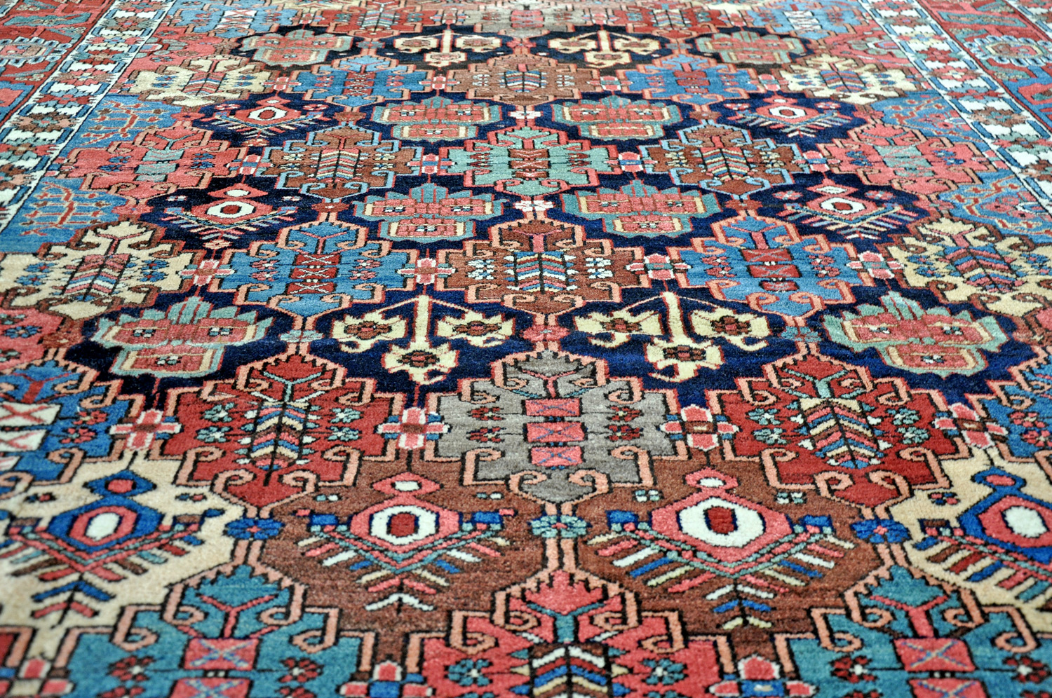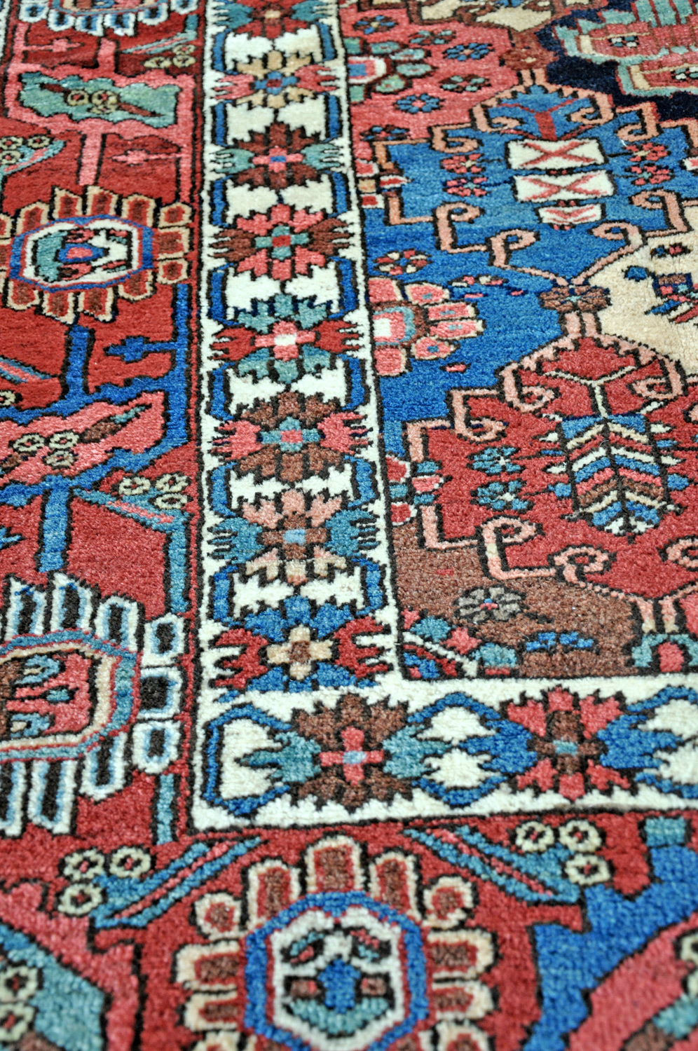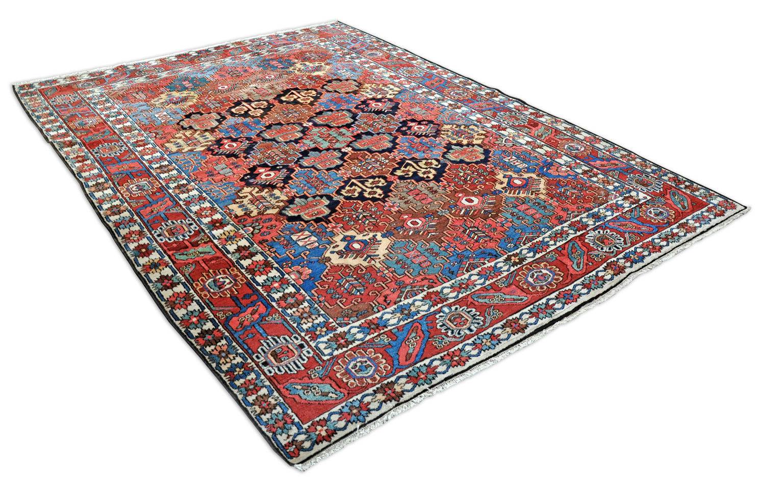 Die Bezeichnung „Bachtiar“ entstammt einer Zeit, in der man die Grundherren des Gebietes, in dem die Teppiche noch heute geknüpft werden, Bachtiaren nannte. Heute werden Bachtiar Teppiche in Heimarbeit von den ansässigen Bauern erstellt. Der Bachtiar ist also kein Nomadenteppich wie vielfach noch angenommen wird. Unser Teppich ist ein typisches Beispiel für die Arbeiten, die vor 50 bis 100 Jahren entstanden und die, ihrem ursprünglichen Verwendungszweck entsprechend, als Hauptteppich im Raum benutzt wurden.