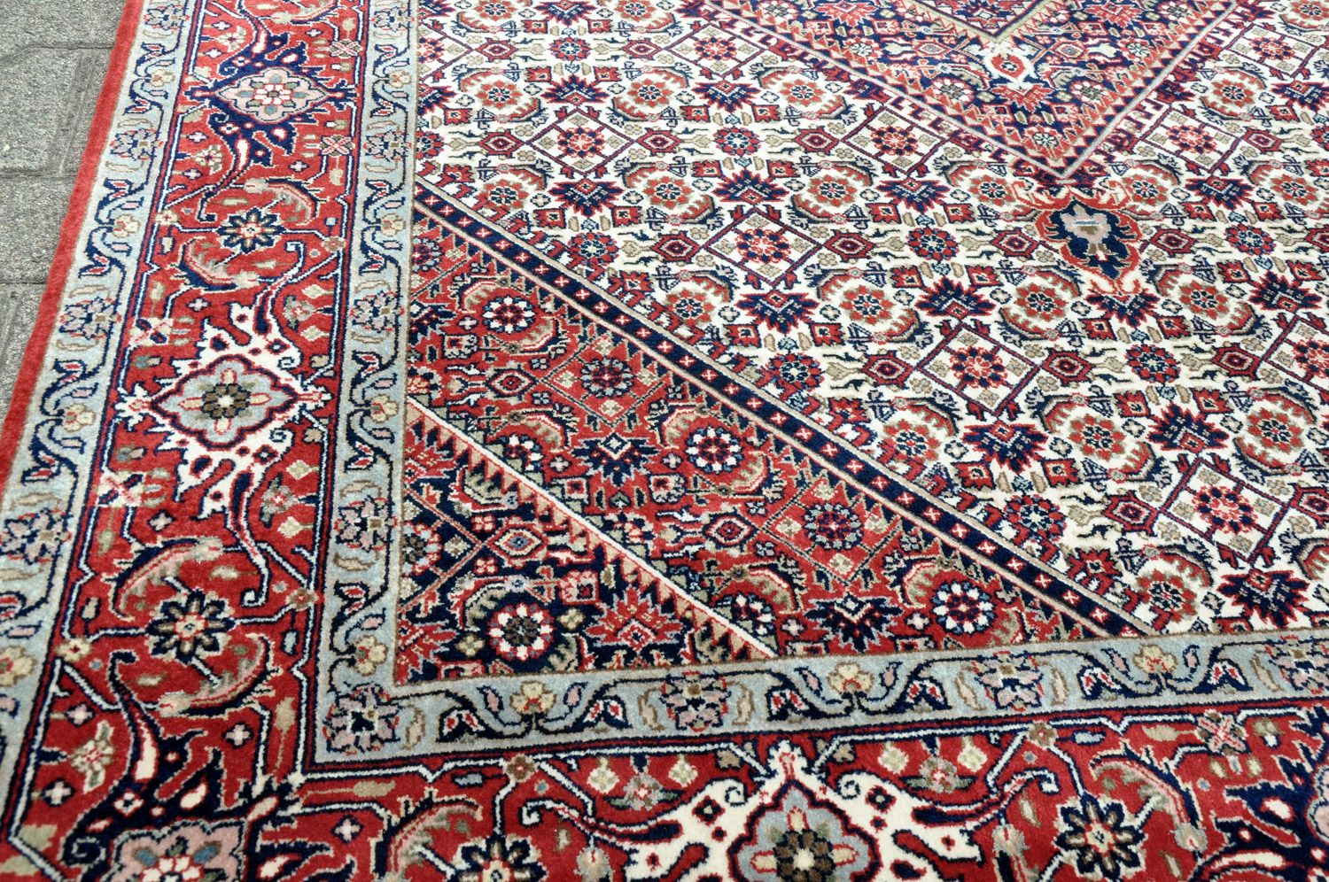 Eine hochwertige Nachknüpfung eine Bidjar Teppichs aus Indien in der klassischen Orient Grundfarbe rot.