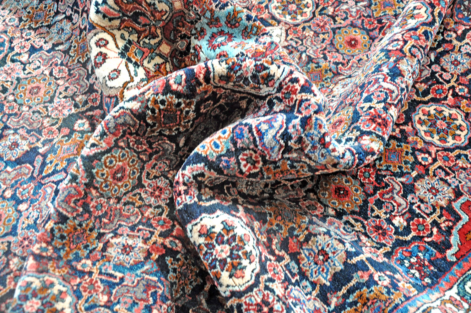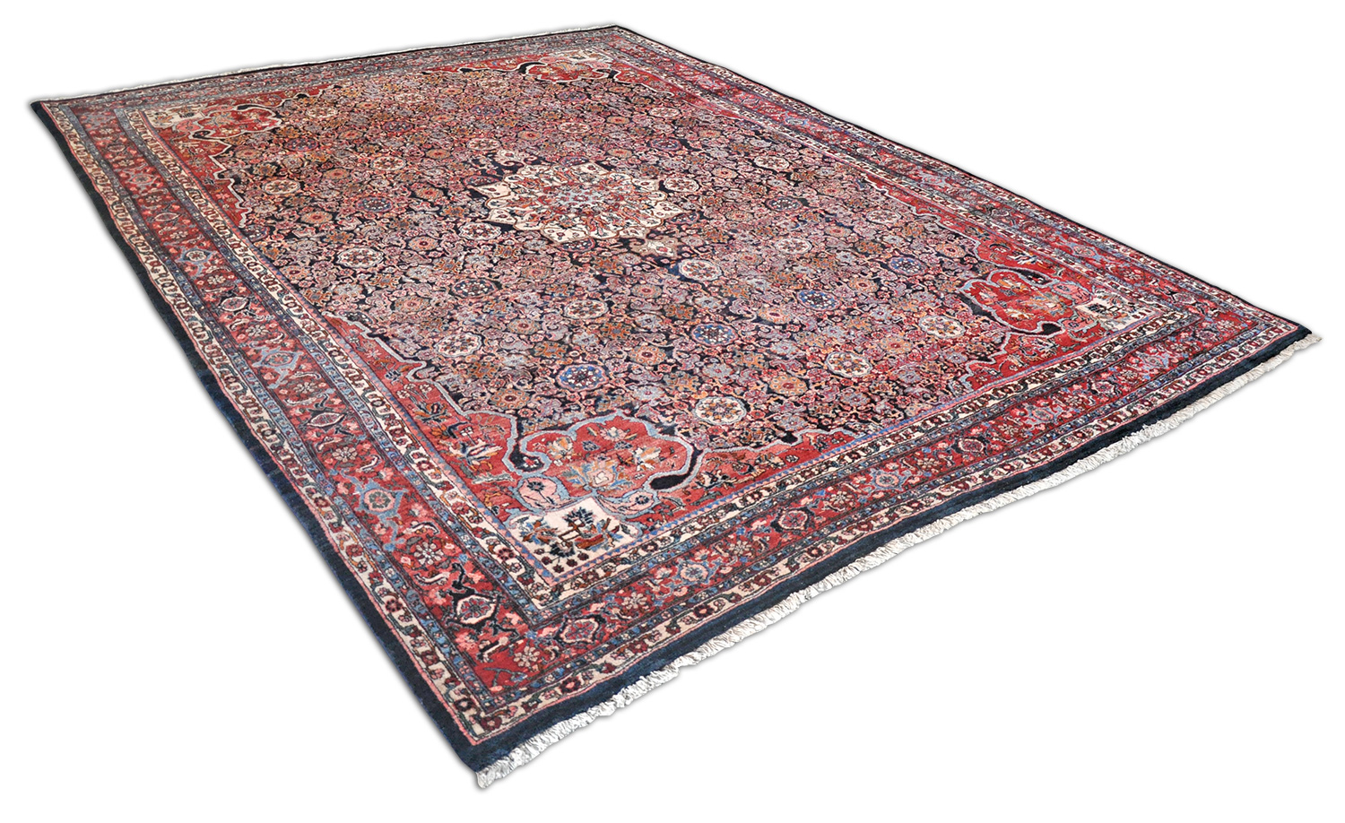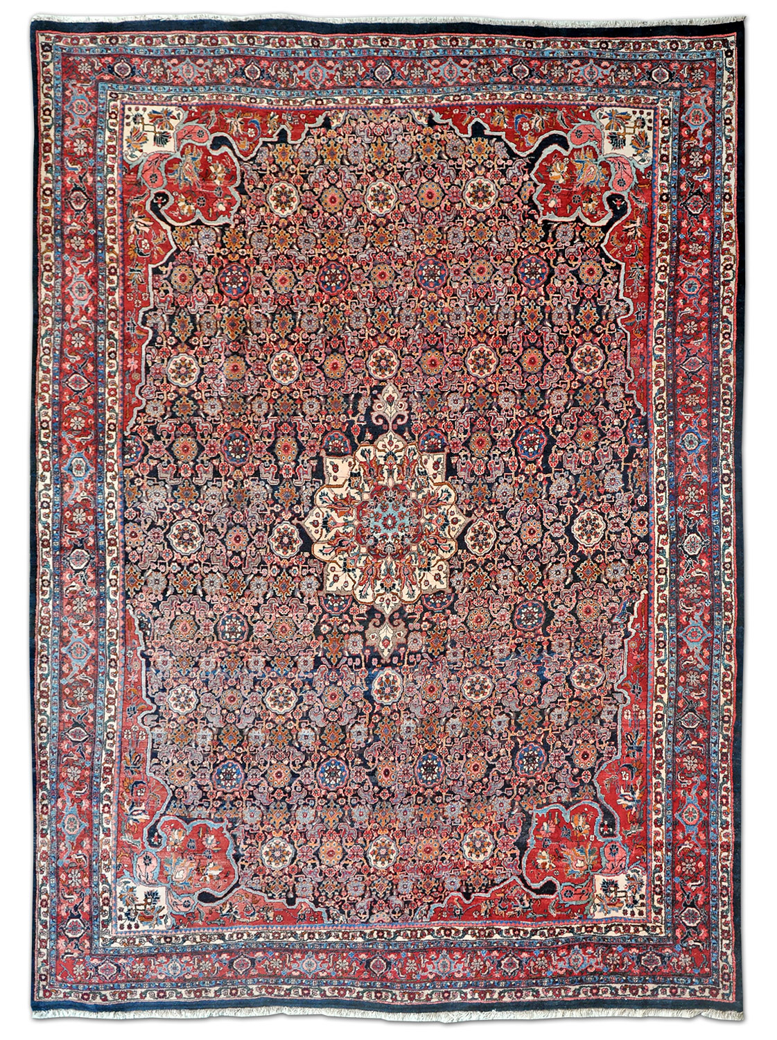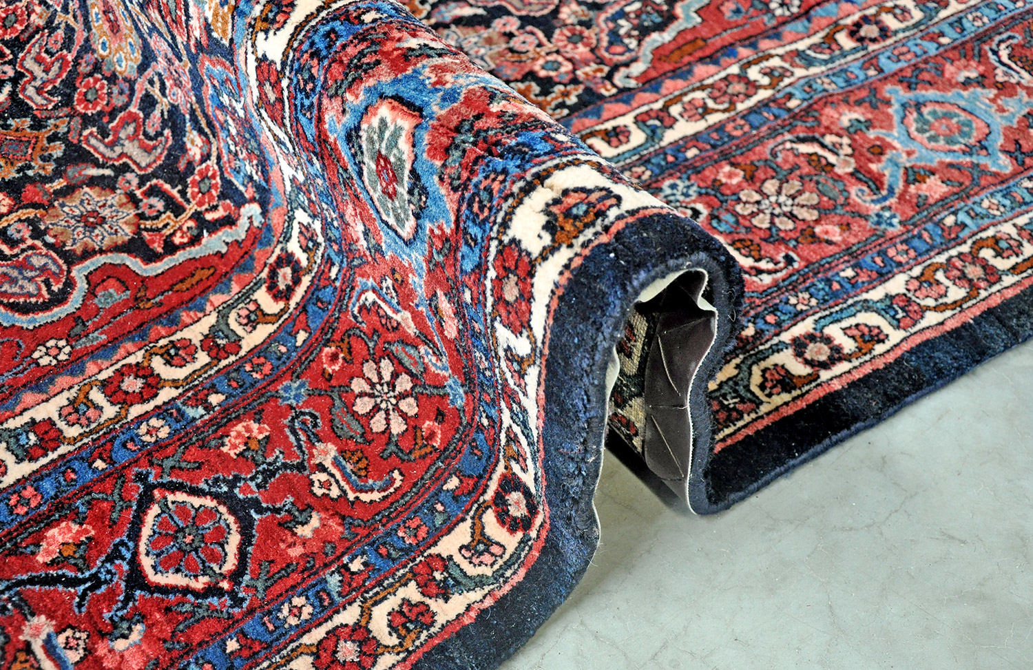 Die westperischen Bidjarteppiche gelten als die strapazierfähigsten ihrer Gattung überhaupt. Meist wird die Wolle, bevor Sie verknüpft wird, angefeuchtet, so dass ein sehr dichtes Wollvlies als stabile Grundlage des Teppichs entsteht. Bereits im 19. Jahrhundert wendeten die hier ansässigen Kurden diese Technik zur Herstellung von großformatigen, repräsentativen Teppichen an. Dieses Exponat ist ein typisches Beispiel für die Arbeiten, die zu jener Zeit entstanden und die, ihrem ursprünglichen Verwendungszweck entsprechend, als Hauptteppich im Raum benutzt wurden.