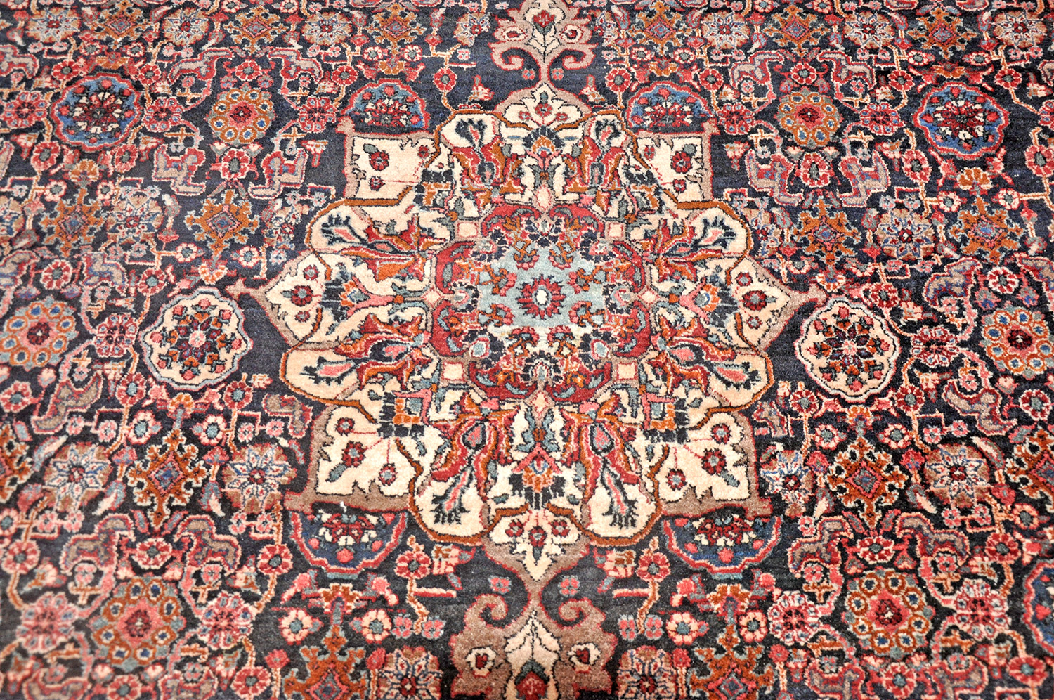 Ein dekorativer großformatiger Perserteppich mit Herati-Musterung und einem kleinen Medaillon. Typisch für diesen Teppich sind die bunten Farben, die mit dem dunkelblauen Fond einen lebhaften Kontrast bilden.