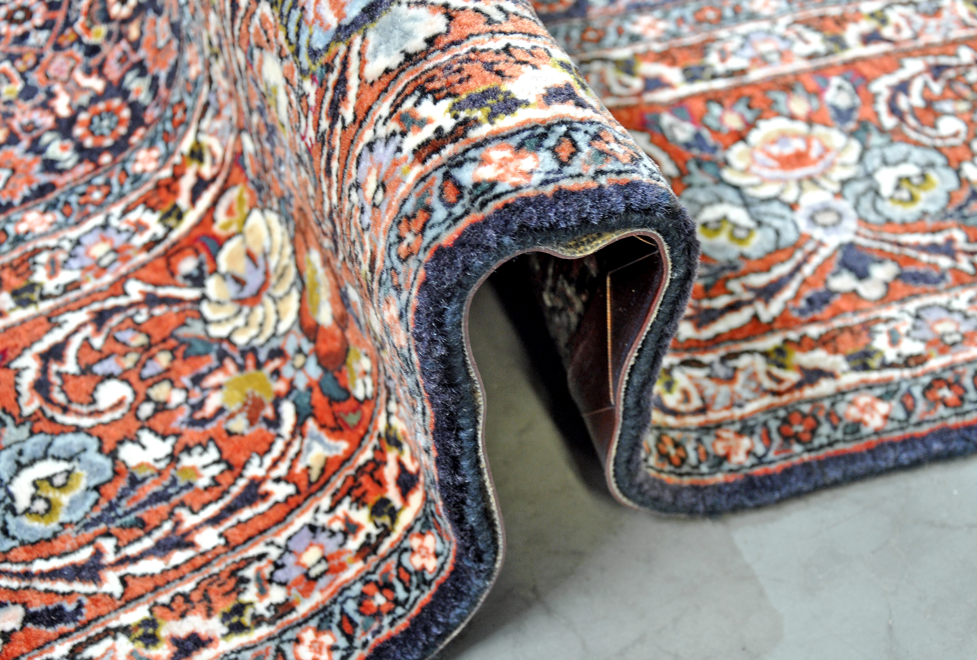 Sehr harmonische Farben mit dem Grundton Dunkelblau und einem rotbrauen Herati-Muster machen dieses Stück zu einem sehr dekorativen Element.