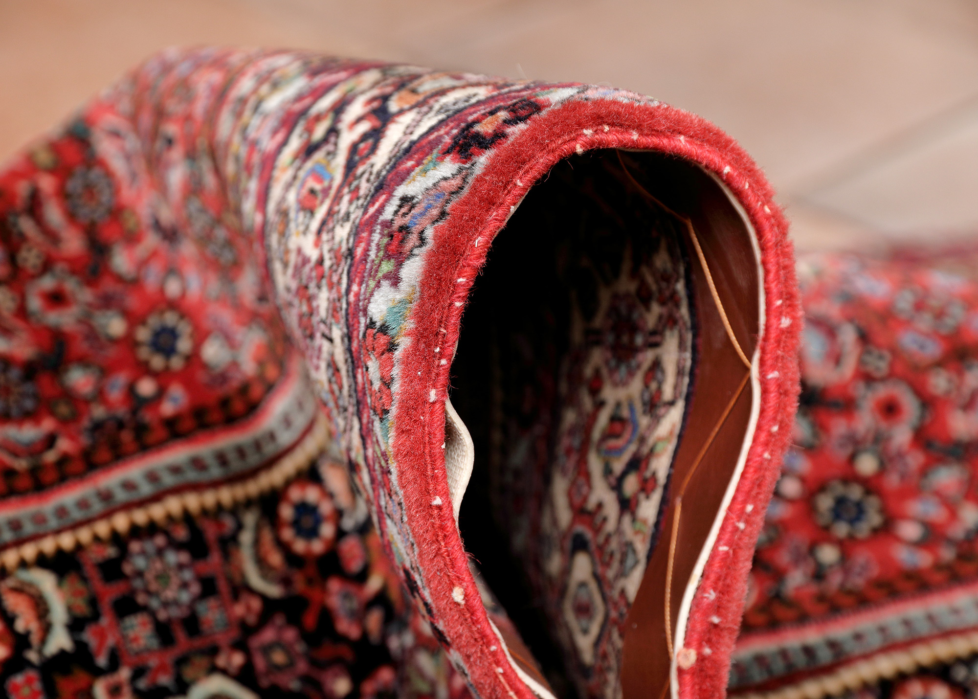 Tekab liegt 50 km nordwestlich von Bidjar. Beide Bidjar-Gruppen unterscheiden sich in erster Line durch die Stärke des verwendeten Schußfadens. Beim kurdischen Bidjar wird ein besonders dickes Schußgarn extrem hart angeschlagen. Dadurch entsteht der brettig-harte Teppich, der dazu neigt zu brechen, wenn man es unterlässt, ihn mit der Florseite nach außen zu falten. Vom Muster her unterscheiden sich die beiden Bidjar-Gattungen kaum. Sehr beliebt bei beiden Arten ist das sogenannte Heratie-Muster, dieses kann sehr feingliedrig sein oder oft auch aus einem mächtigen ausladenden Hexagon bestehen.