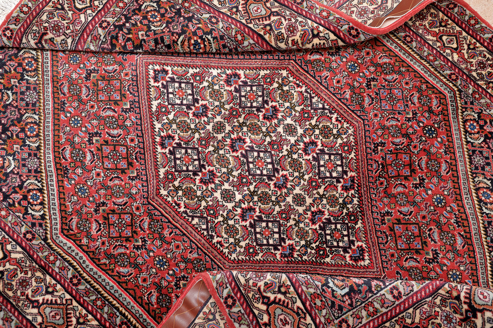 Ein feiner Bidjar Perserteppich mit sehr feiner Herati-Musterung und einem beige-farbigen Rauten-Medaillon - angeordnet in einem Hexagon. Der Grundton dieser Brücke ist ein gedecktes Rot mit 3 Farbwechseln bis zur Hauptbordüre. Die Hauptbordüre ist in beige gehalten.