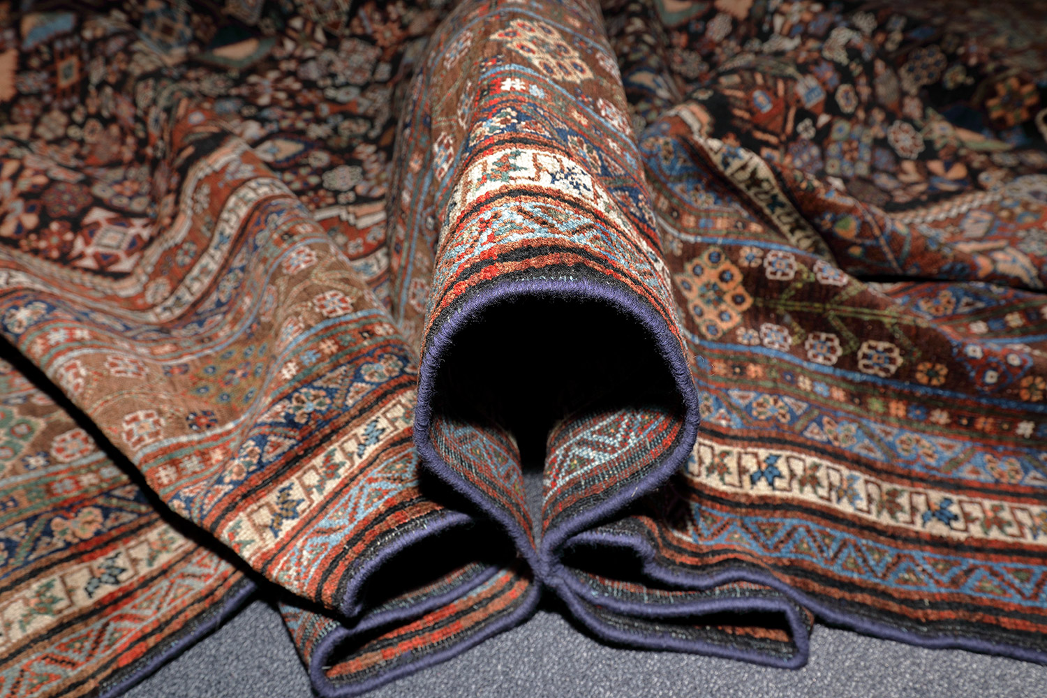Kennzeichnend für dieses Stück ist das rotgrundige Mittelfeld mit großem, hakenbesetztem dunkelblauem Rautenmotiv und Medaillon. Insgesamt ist der Teppich dicht besetzt mit Vasen, Blütenstauden, einzelnen Blüten, Sternmotiven und eingestreuten Tierdarstellungen. In den Zwickeln befinden sich vier Rosetten, die Hauptbordüre besteht aus aneinander gereihten stilisierten Blüten mit jeweils drei seitlichen Nebenborduren. Auffällig sind weiterhin die beidseitig gewickelten Shirazi sowie kurze Fransen an beiden Enden.