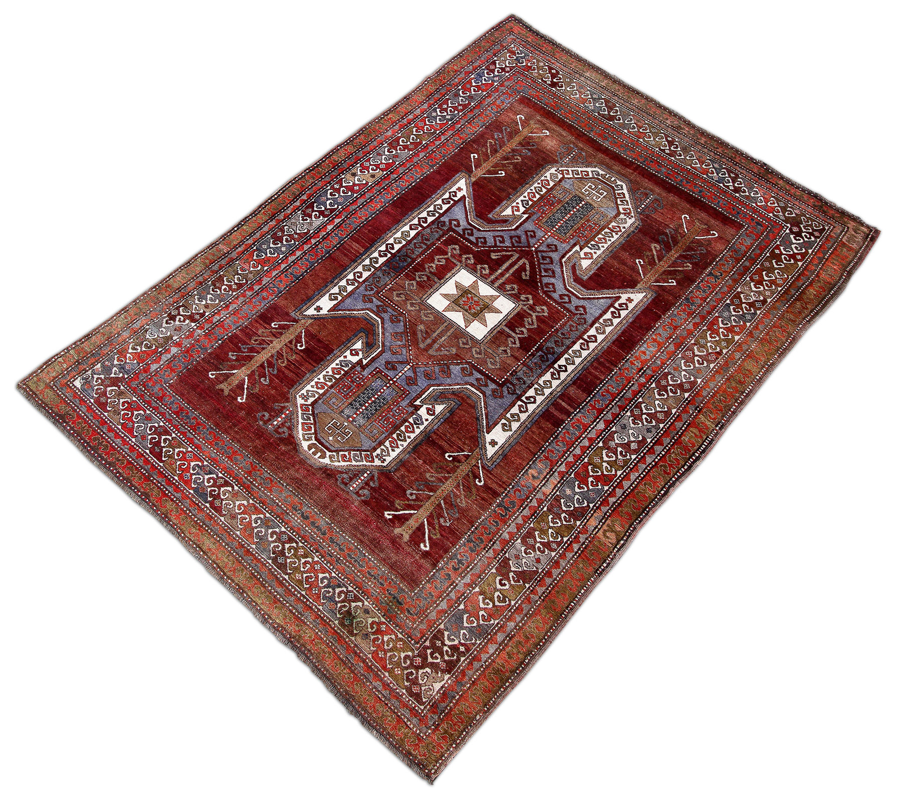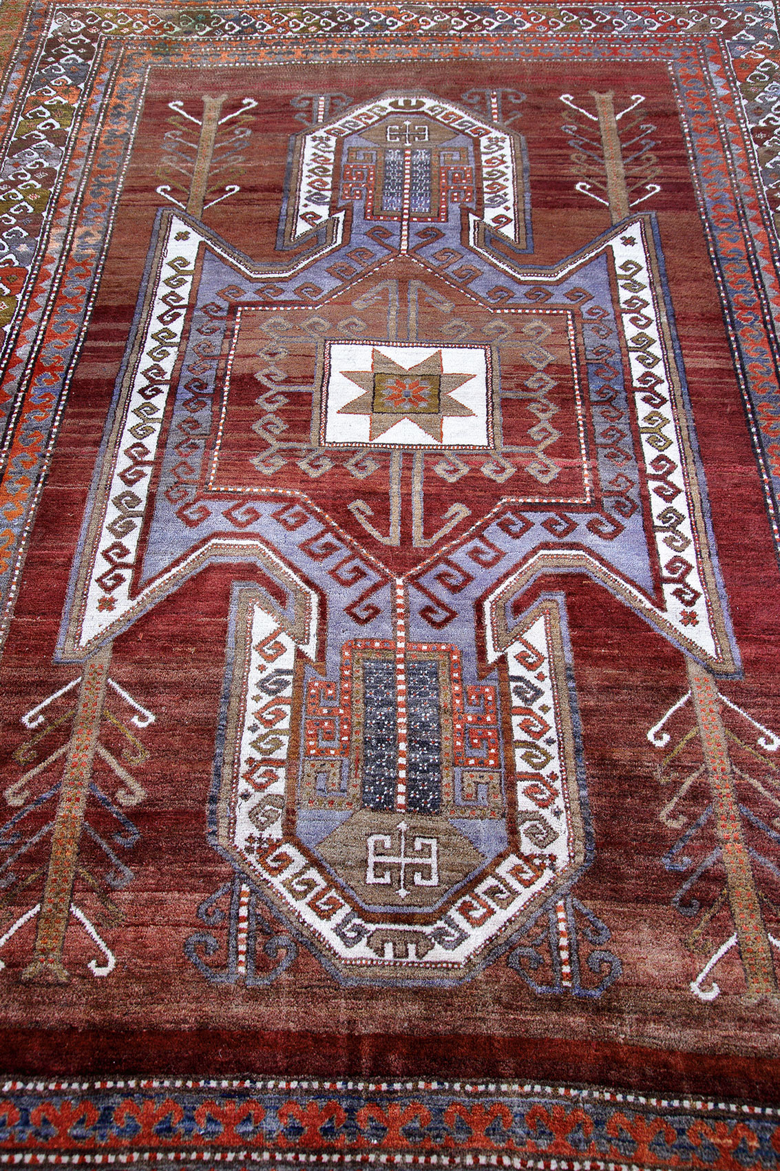 Ein türkischer Teppich, streng geometrisch in der Tradition altkaukasischer Muster geknüpft und deshalb auch oft als Kars Kasak bezeichnet. Dieses Exemplar ist in einem dunklen sehr warmen Rot gehalten, in Anlehnung an einen Schild-Kazak.