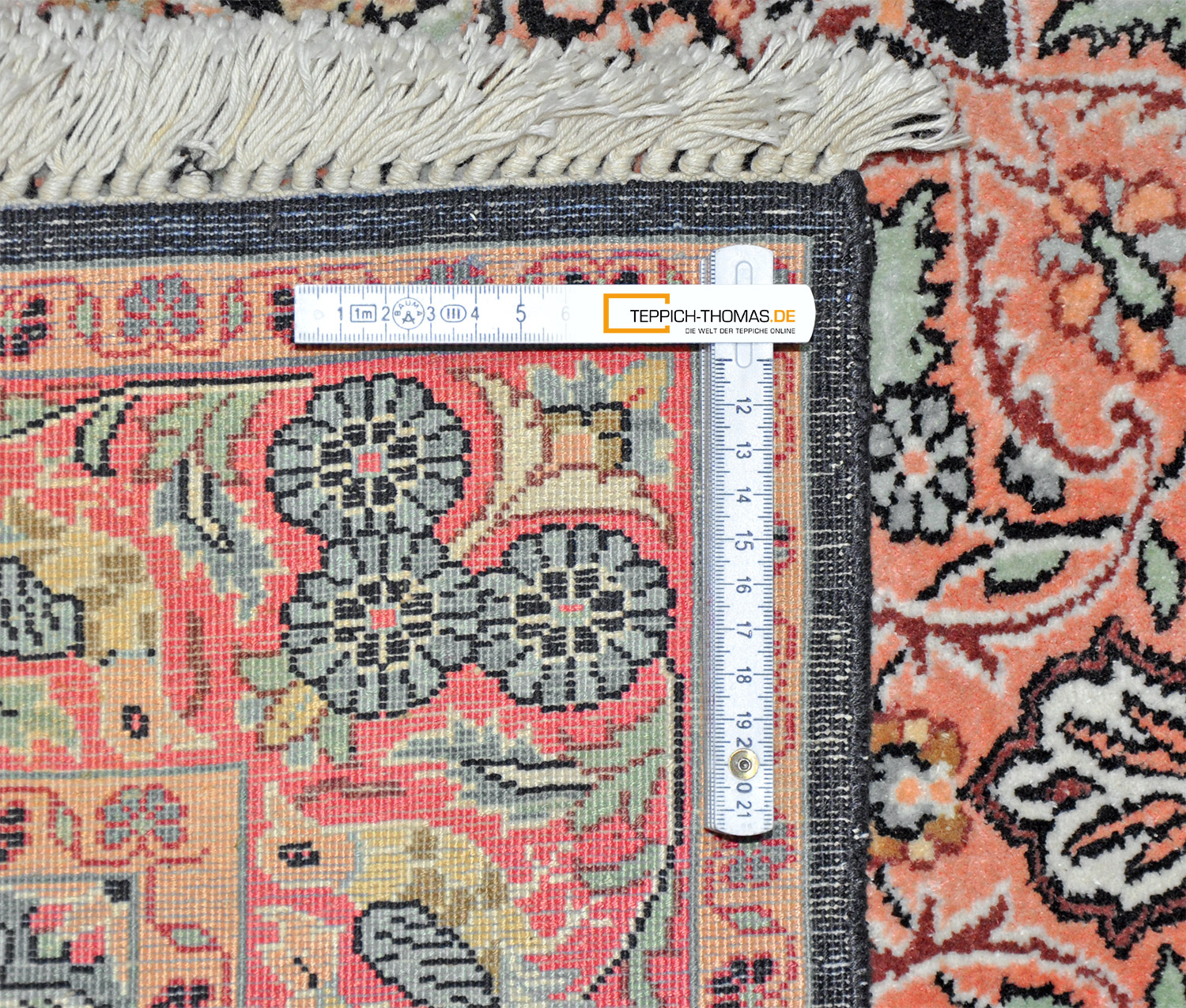 Entdecken Sie die Schönheit indischer Handwerkskunst mit diesem exquisiten Kaschmir-Teppich. Das florale Medaillon im Zentrum ist ein echter Blickfang, umrahmt von einem lebhaften Farbenspiel. Der tiefblaue Fond bildet einen eleganten Kontrast zu den Mustern in Taubenblau, Rose und Beige. Die rosefarbene Bordüre vollendet das Kunstwerk und verleiht ihm eine warme Note.