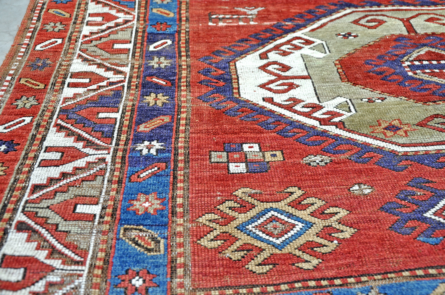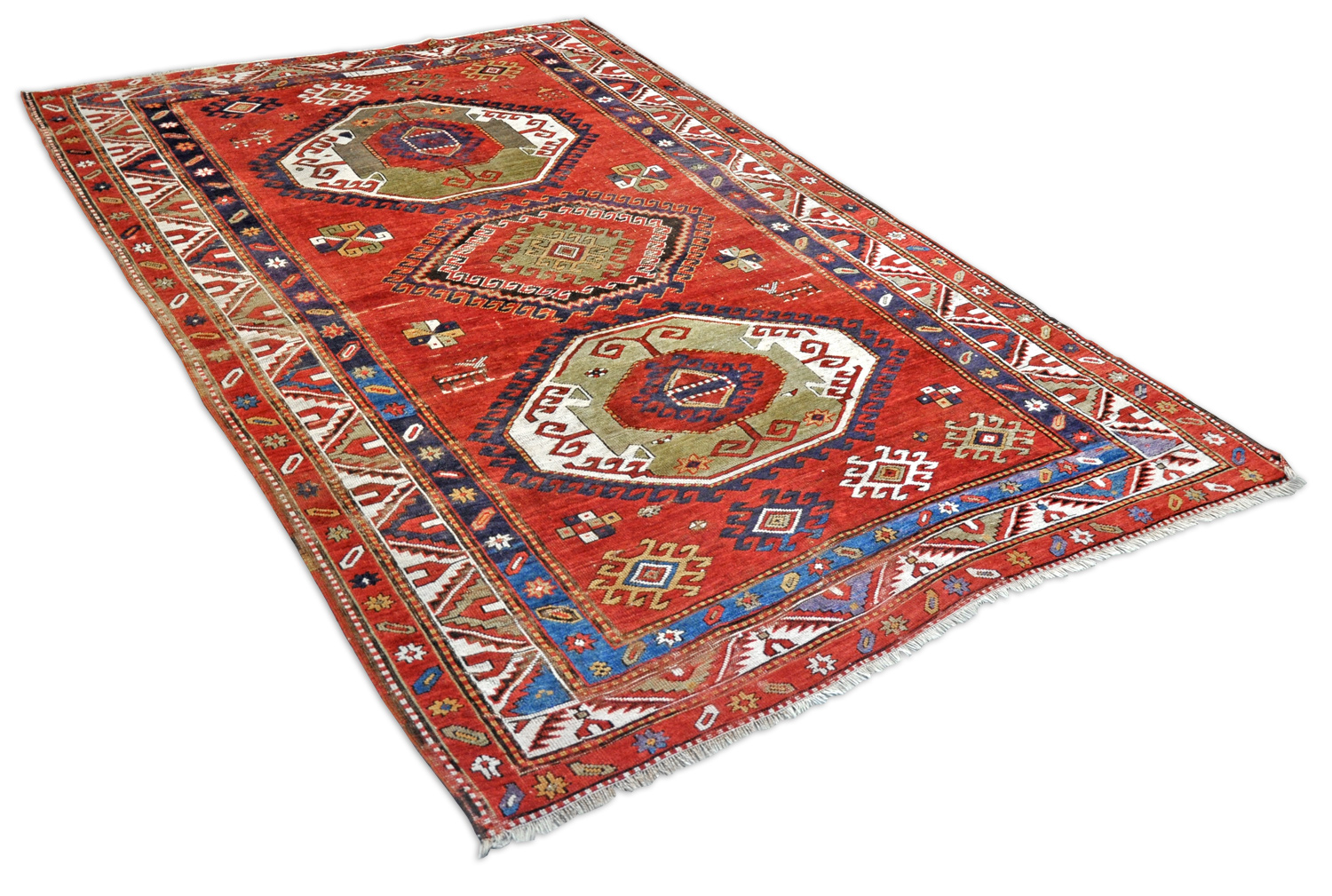 Der Kazak Knüpfteppich ist der bekannteste und am meisten geschätzte kaukasische Teppich. Der Handel bezeichnet als Kazak (oder auch Kasak) jedoch nicht nur Teppiche, die der Stadt Kasak, sondern einem viel größeren Gebiet mit unbestimmten Grenzen im Südwestkaukasus zuzuschreiben sind. Kazak bezeichnet also im Allgemeinen eher eine stilistische Gruppe. Die Kasaks kann man leicht daran erkennen, dass Ihre wichtigsten Schmuckmotive nur in geringer Zahl auftreten und dafür auch in Ihrer Größenordnung über die sekundären Elemente dominieren. Diese sind zahlreicher vertreten, aber niemals dicht gesetzt und auch nicht zu klein! Typisch sind die kräftigen und leuchtenden Farben.