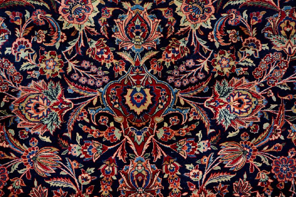 Klassischer Kork-Keschan mit Medaillon Muster auf nachtblauem Grund. Hochwertige Wolle, feine Knüpfqualität, guter Zustand.