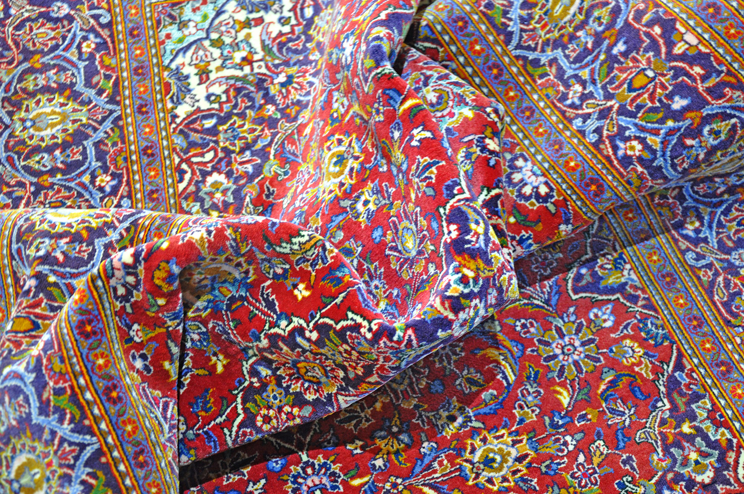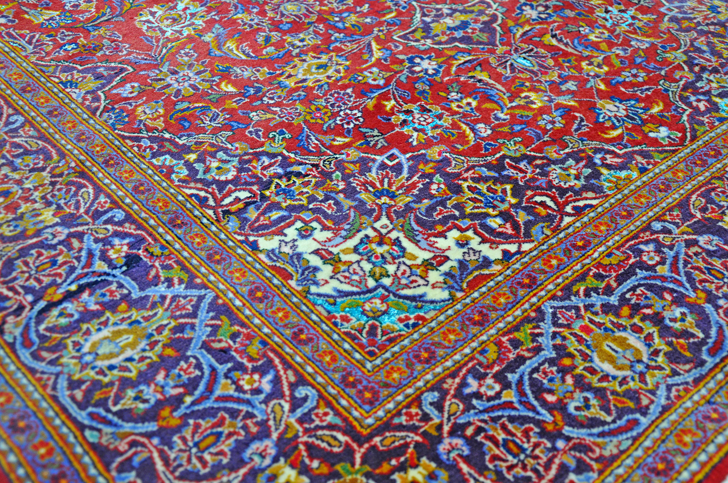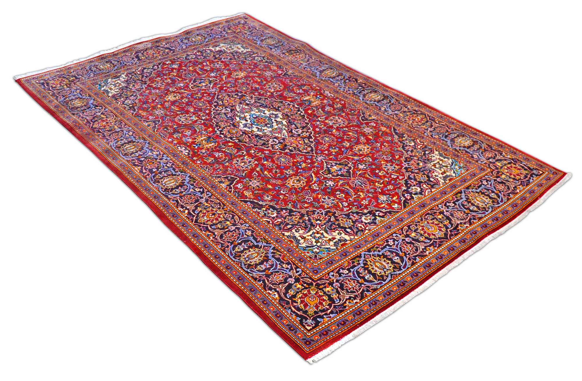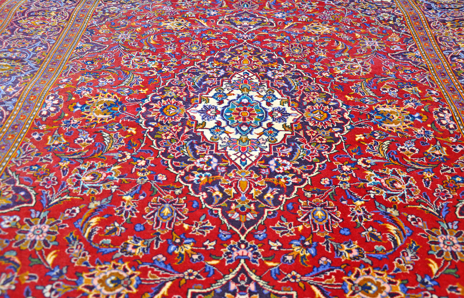 Dieser Keshan Perserteppich ist - aufgrund seines häufiger vorkommenden roten Erscheinungsbildes - ein typischer Medaillon Teppich. Außergewöhnlich bei diesem Stück ist der Umstand, dass reine Seide verarbeitet wurde. Es handelt sich hier daher um einen eher seltenen Woll-Seidenteppich in einer sehr guten Wollqualität, rotgrundig mit Blumenbuketts. Die Hauptbordüre ist in dunkelblau gehalten mit ausgefallenen Blumenmotiven in einem dezenten Rotfraise.