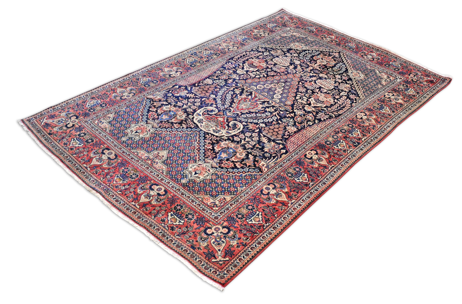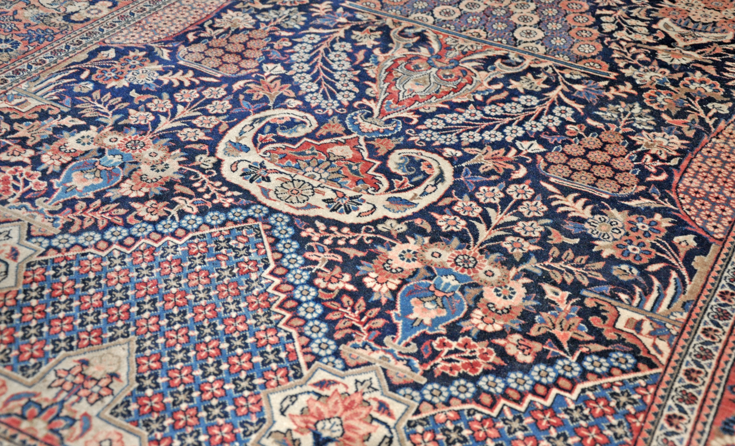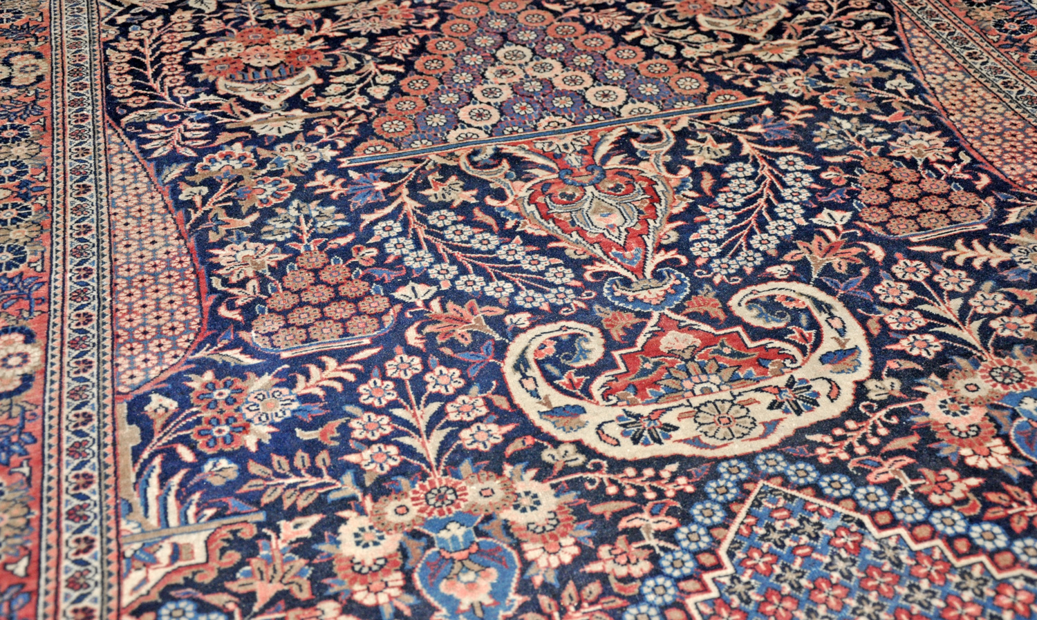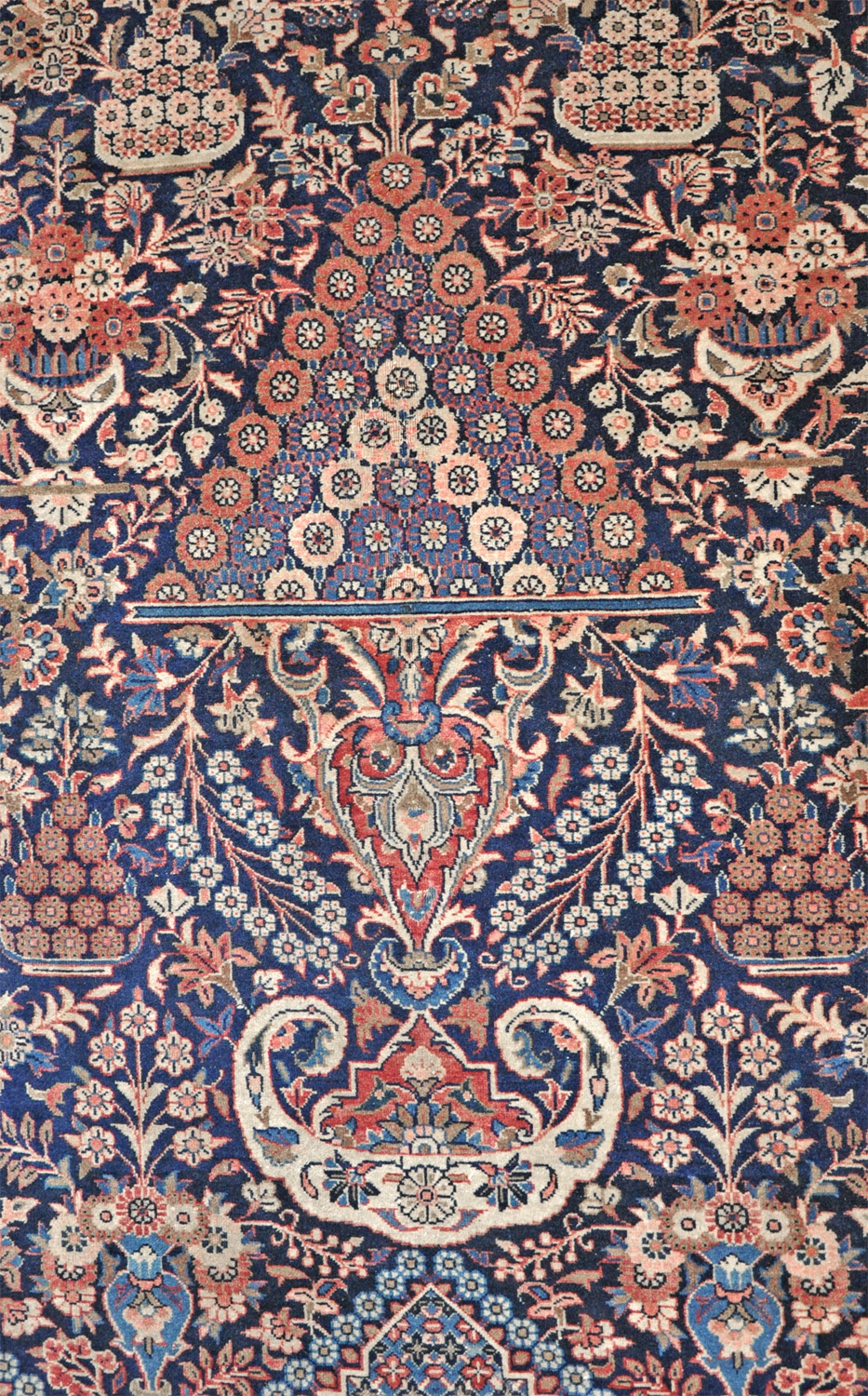 Dieser alte, blaugrundig und mir Blumenbuketts gestaltete Keschan Perserteppich zeigt ein seltenes Vasenmotiv. Die Hauptbodüre zeigt ebenfalls Vasen und ist in einem dezenten Rotfraise gehalten.