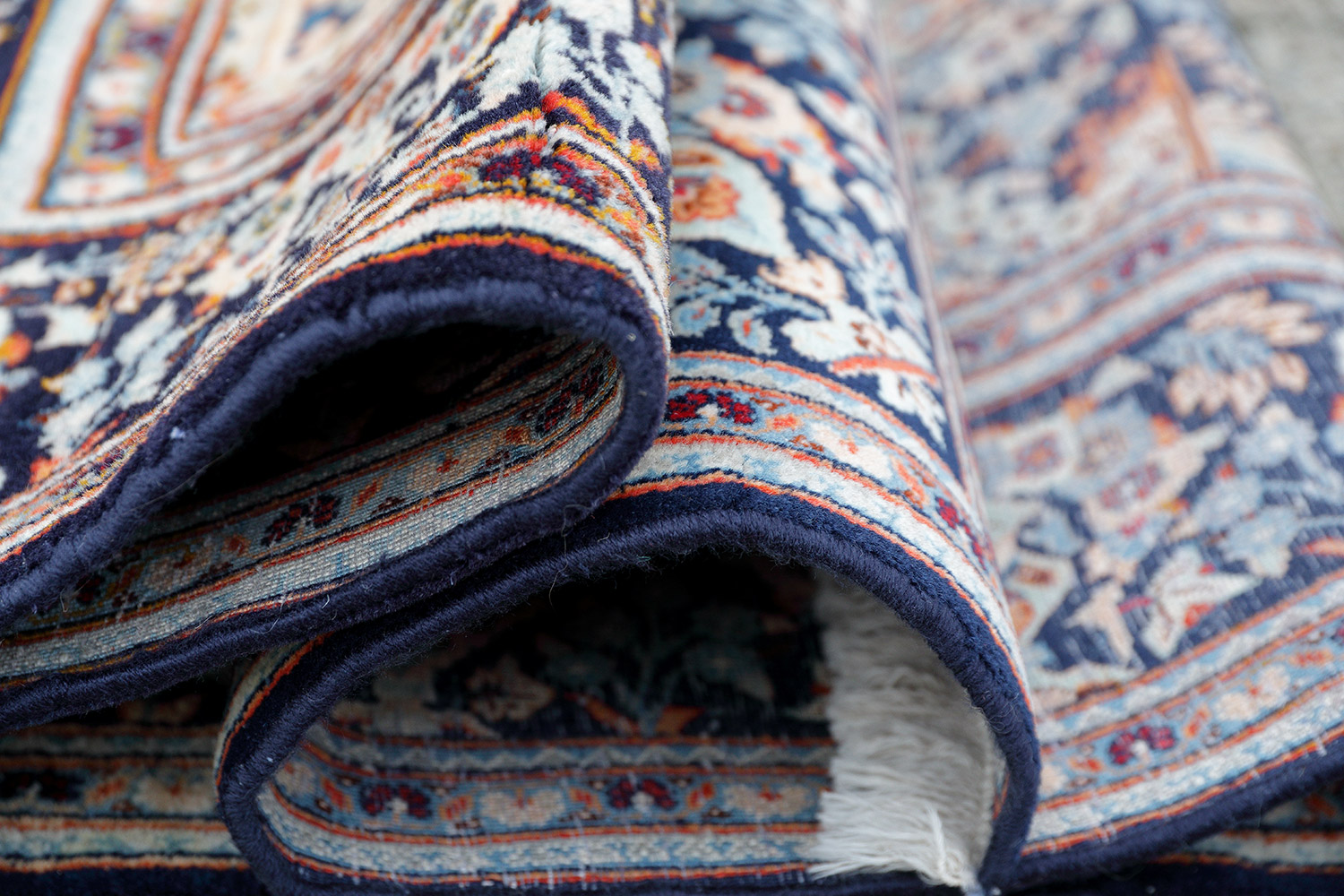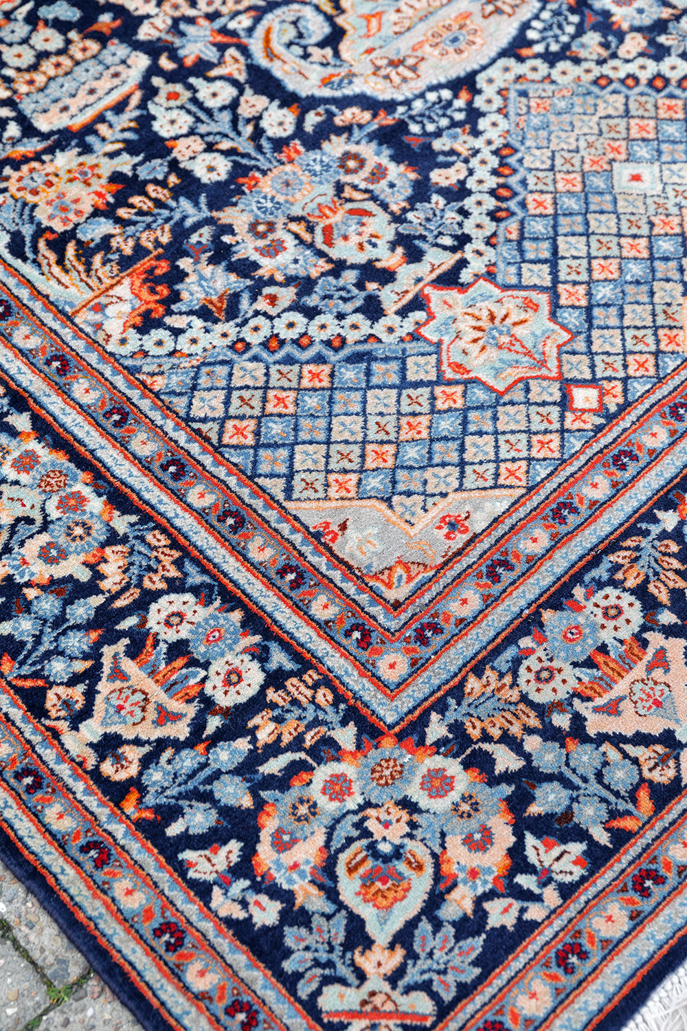 Bei diesem Keshan Perserteppich steht besonders imposant das „Goldani“-Vasenmotiv auf dem indigoblauen Fond und wird in hoher Symmetrie von Blütenstauden und Zypressen umrahmt. Die Ampel der angedeuteten Gebetsnische und die königliche Krone werden von einem Blütenaufbau eingefasst. Klassisch und dekorativ, erhaben prunkvoll und künstlerisch perfekt besticht die Zeichnung in Ihrer knüpferischen Vollendung.