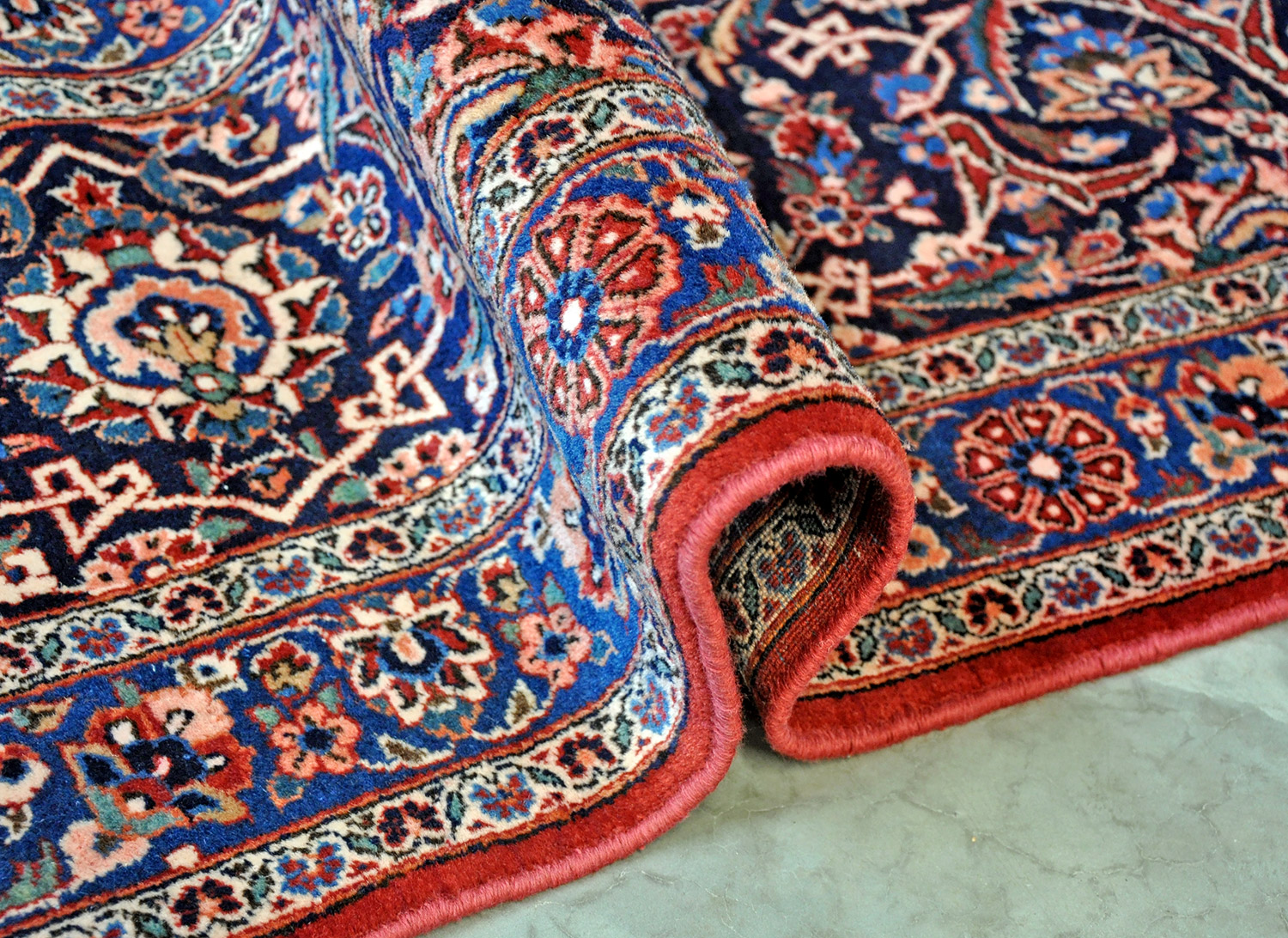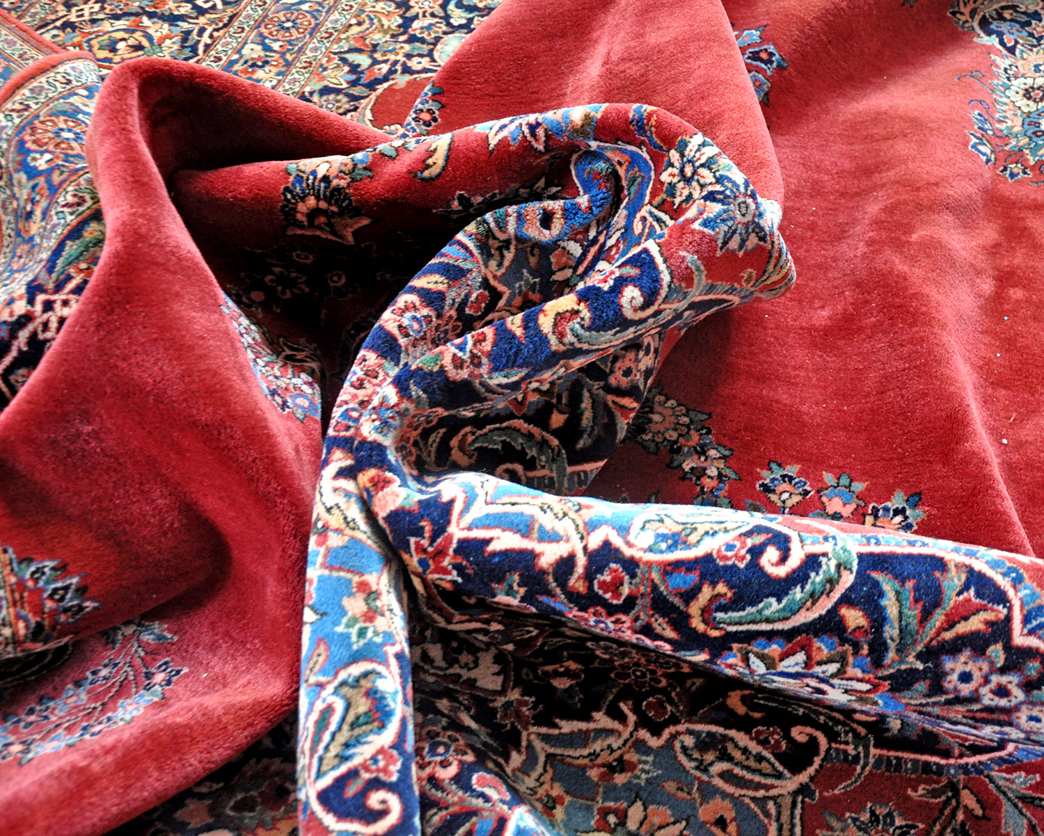 Samtartig fühlt sich das Flormaterial dieses Keshan Teppichs an. Die Abbildung erreicht leider nicht den absoluten Farbeffekt dieses Teppichs. Die Farben sind in Wirklichkeit wesentlich zarter und das Rot mehr in blaurot gehalten. Die Teppichknüpfer schufen hier eine Perle des klassischen Spiegel-Keshans.