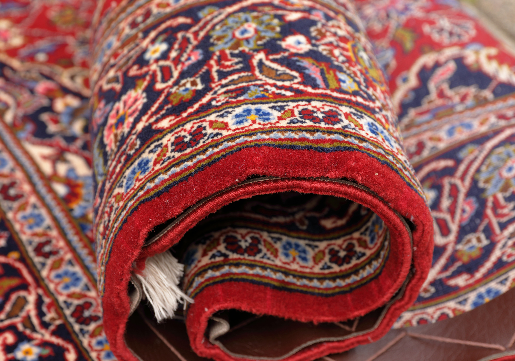 Hier handelt es sich um einen typischen Medaillonteppich in der klassischen Rotrichtung. Außergewöhnlich bei dieser großen Brücke in einer heute leider selten vorkommenden sehr guten Wollqualität ist das seltene Maß. Der Teppich ist rotgrundig mit Blumenbuketts, die in blau gehaltene Hauptbordüre zieren ausgefallene Blumenmotive in einem dezenten Rotfraise und Blau.