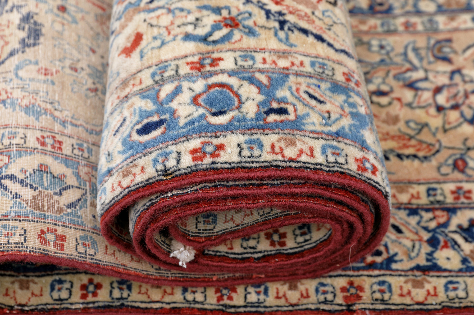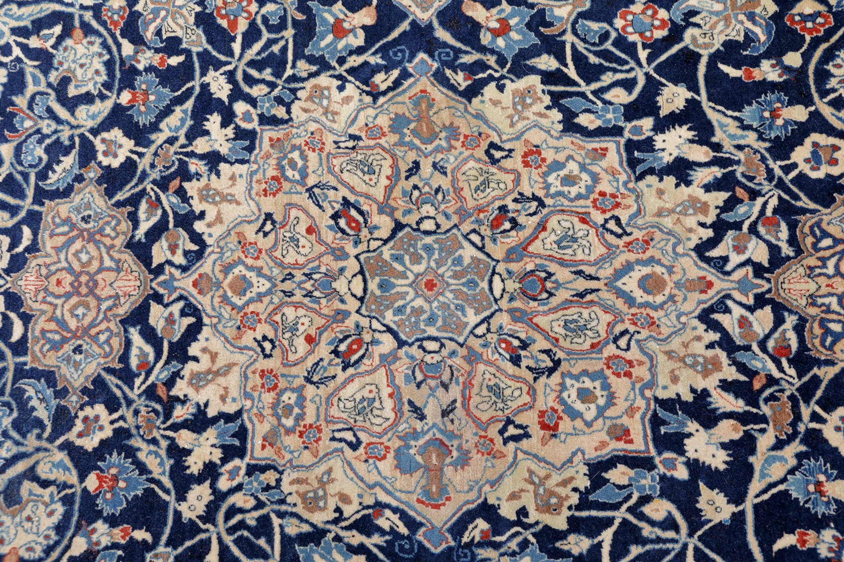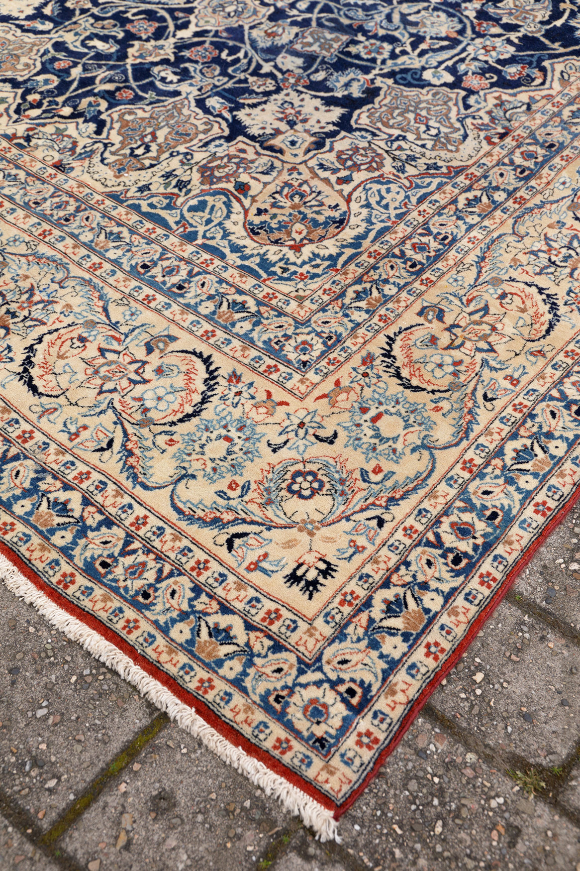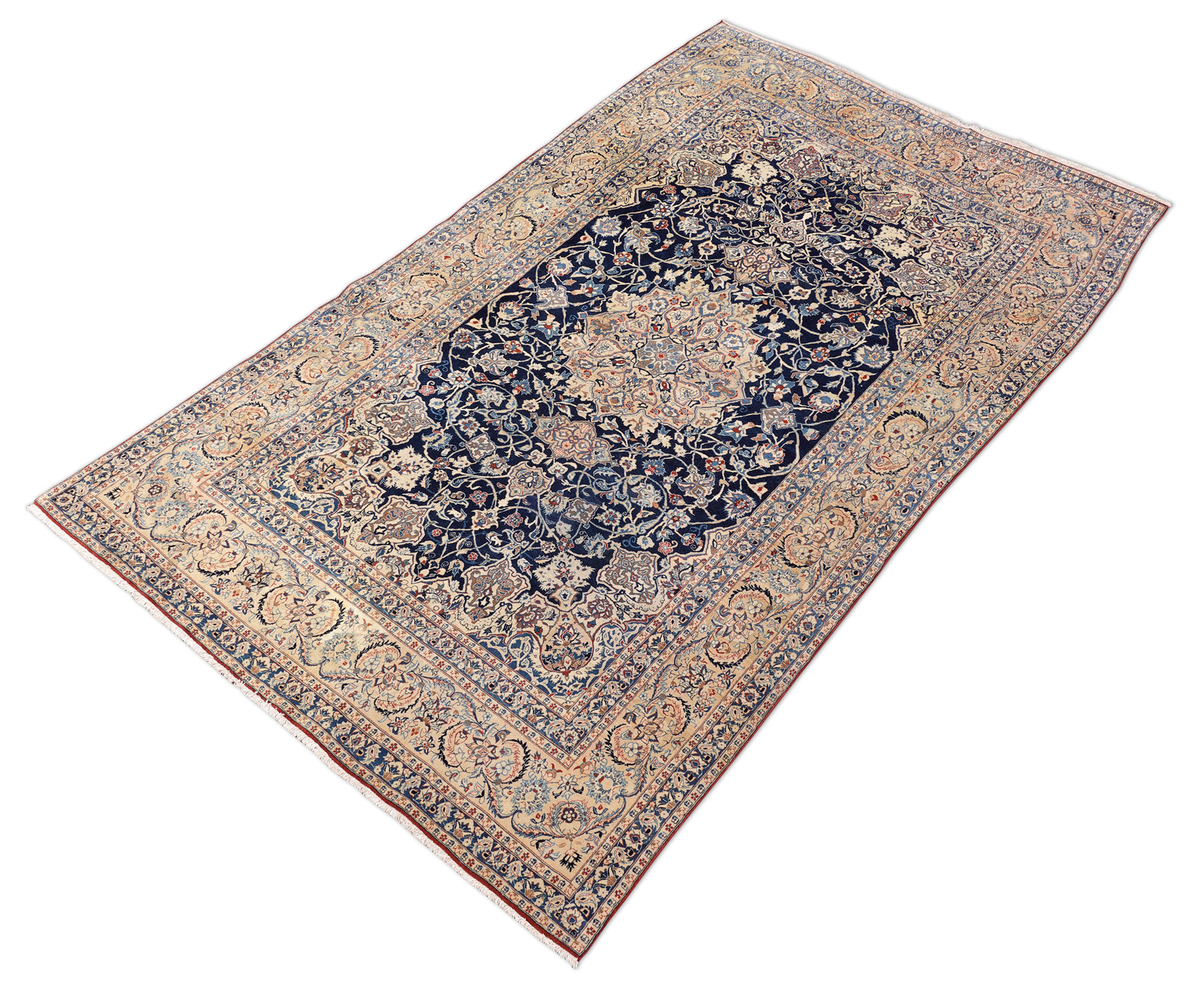 Ein blaugrundiger Teppich in den typischen Farben eines Nain. Bei diesem Exemplar handelt es sich um einen Tudesch Nain. Die Größe ist eher selten, in der Regel sind diese Teppiche deutlich länger. Kennzeichnend sind das entrale Blütenmotiv und die zum Teil in blau und beigen gehaltenen Füllelemente. Die Konturen sind mit Seide gearbeitet , die rote Tudesch-Schirazikante ist aufgrund des Alters etwas braunstichig.