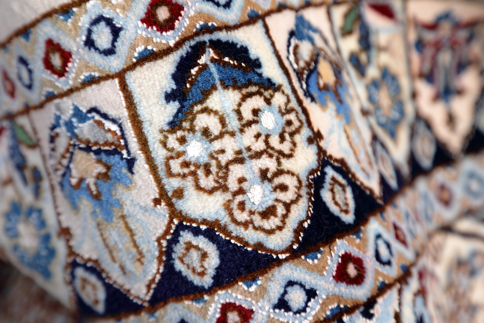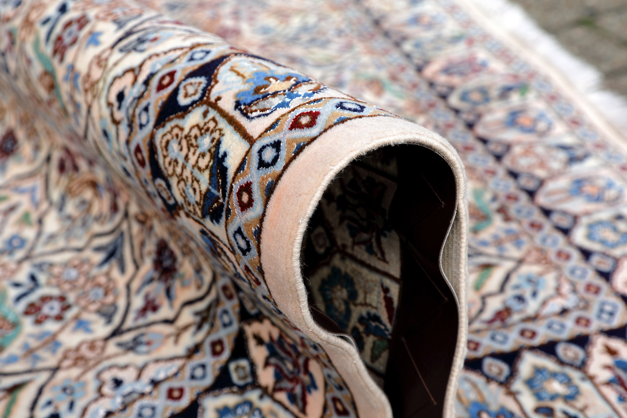 Bei Nain-Teppichen handelt es sich um besonders fein geknüpfte Stücke mit vorwiegend hellem Kolorit. Die Hauptfarben kontrastieren zumeist im elfenbein-/sand- sahnefarbenen Ton mit hell- bis dunkelblauen Tönen.