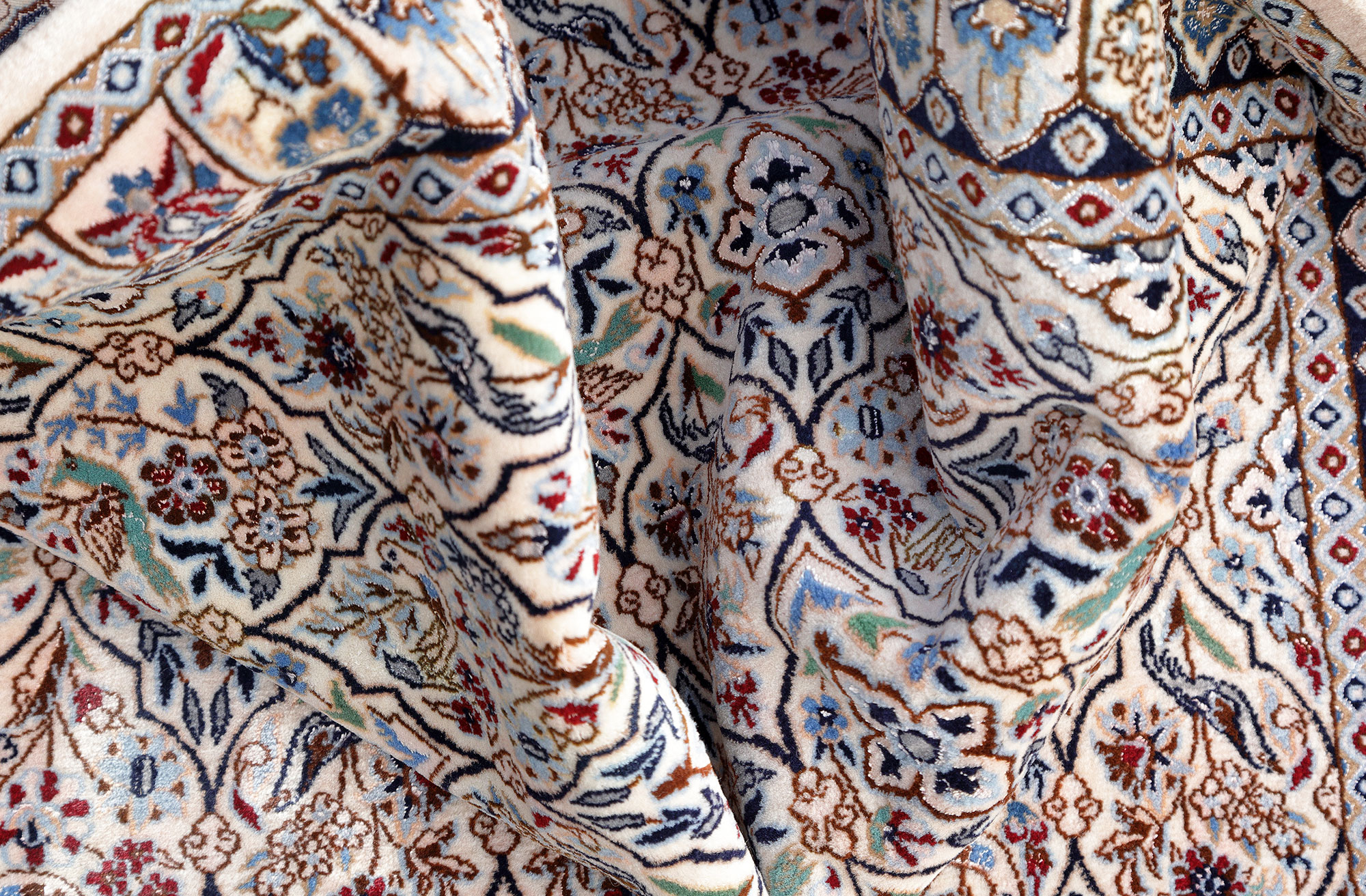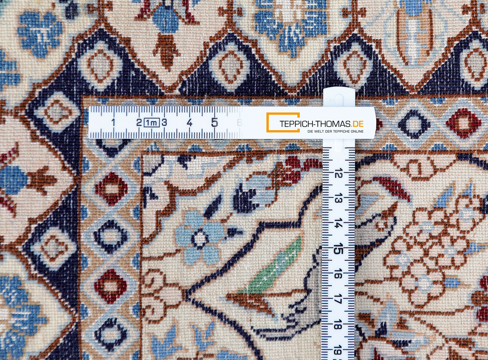 Eine beige grundige Brücke in den für einen Nain-Teppich typischen Farben. Der Perserteppich zeigt ein Allover-Motiv eines Blütenmusters mit vereinzelten Vögeln. Die Füllelemente sind zum Teil in blau und grün gehalten. Die Konturen wurden mit Seide gearbeitet.