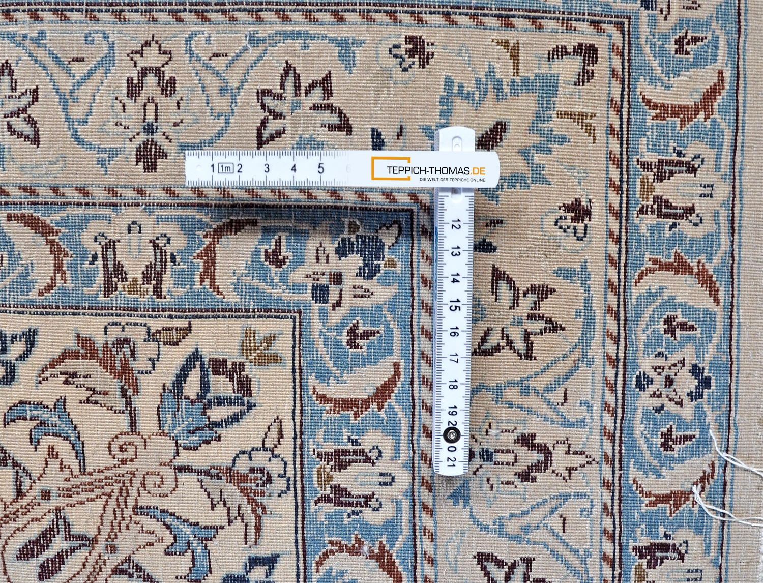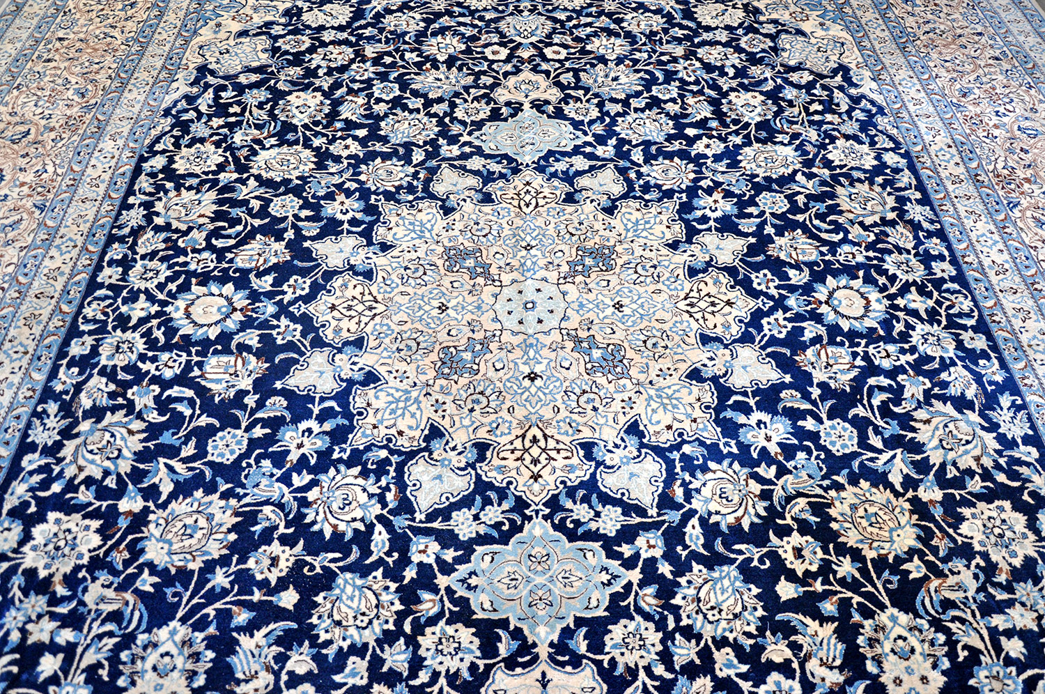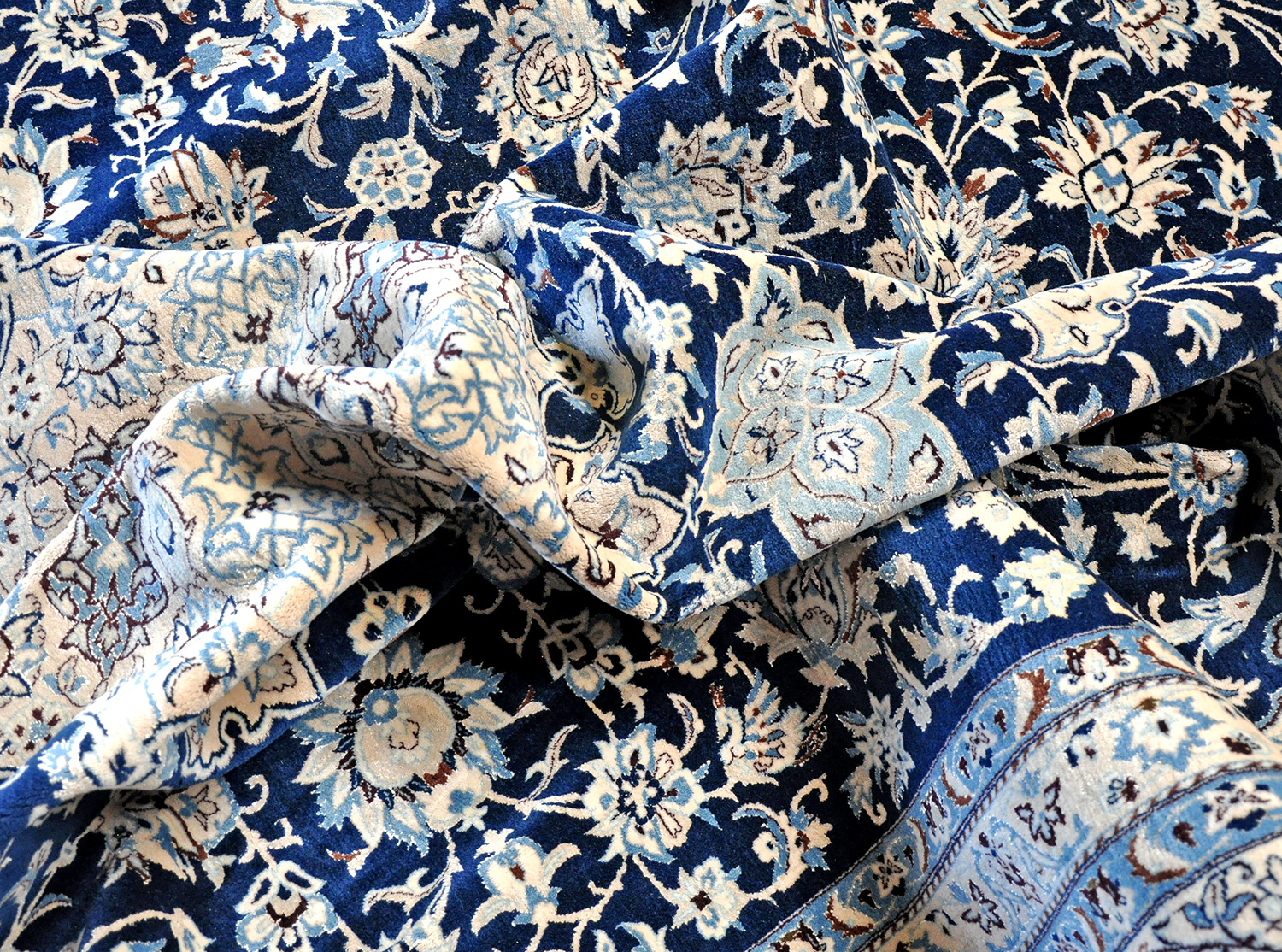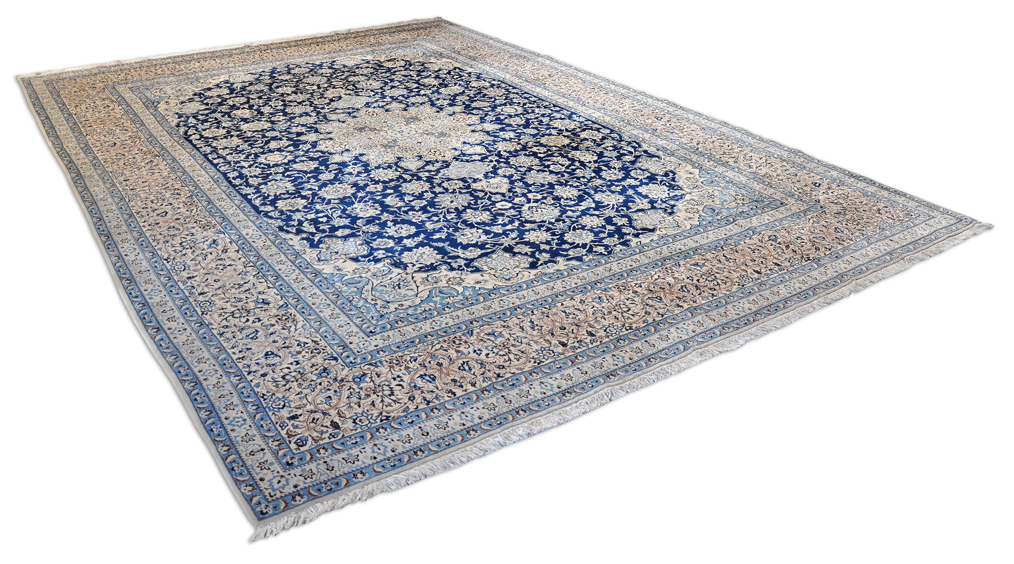 Ein blaugrundiger Übermaßteppich in den für einen Nain Perserteppich typisch hellen Farben. Der Teppich wurde mit Seide gearbeitet, der Grundton ist dunkelblau - sehr dezent gefüllt. Kennzeichnend sind das zentrale Medaillon sowie die Eckzwickel.