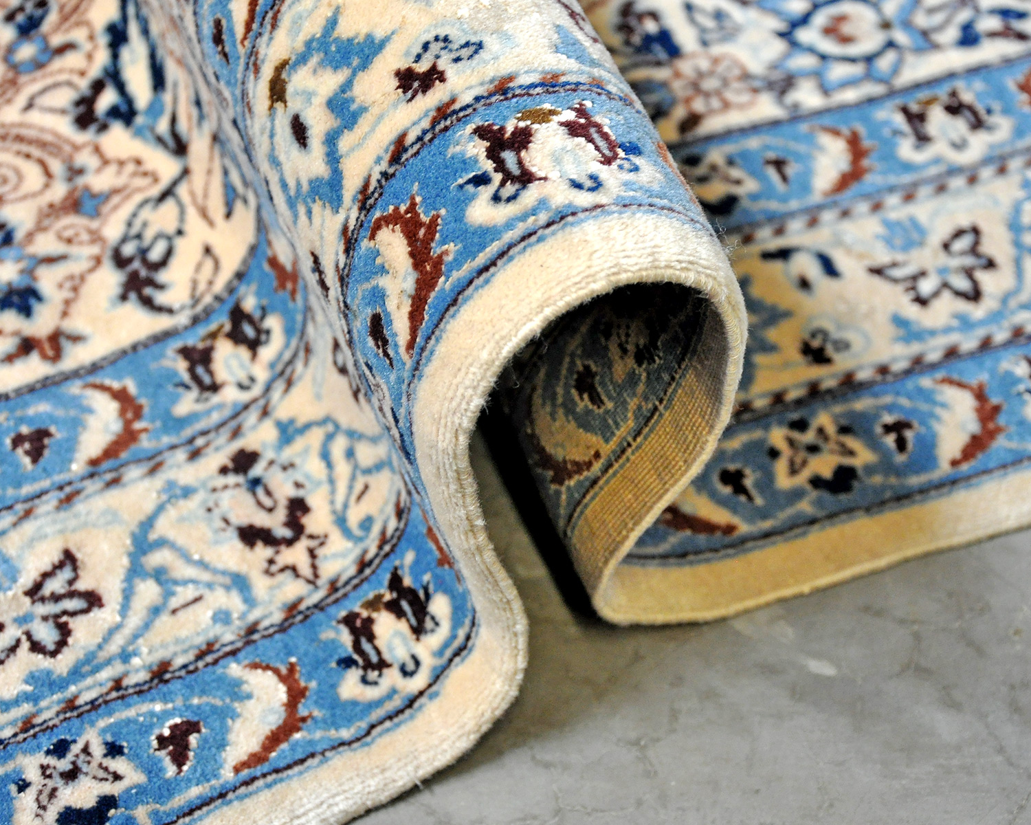 Bei Nain-Teppichen handelt es sich um besonders fein geknüpfte Stücke mit vorwiegend hellem Kolorit. Die Hauptfarben kontrastieren zumeist im elfenbein-/sand- sahnefarbenen Ton mit hell- bis dunkelblauen Tönen.