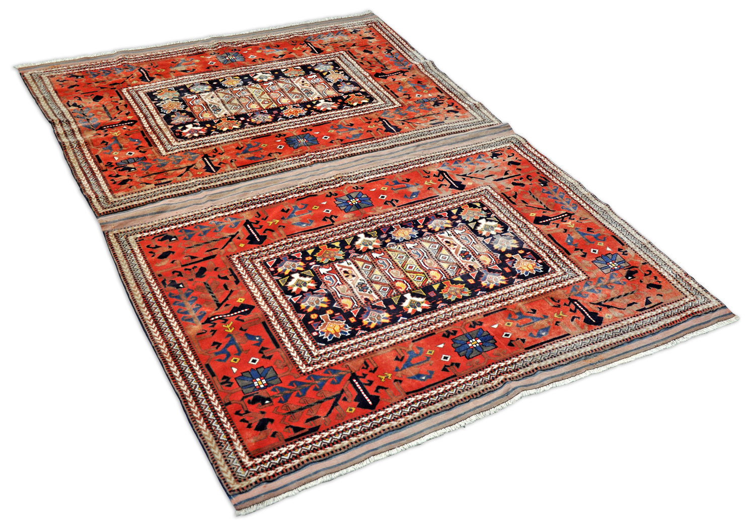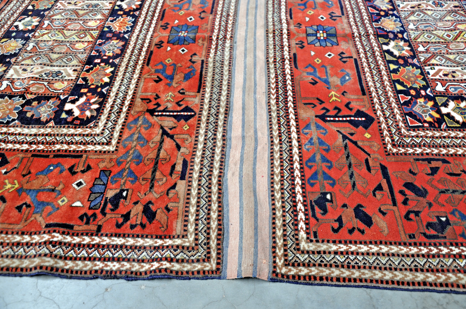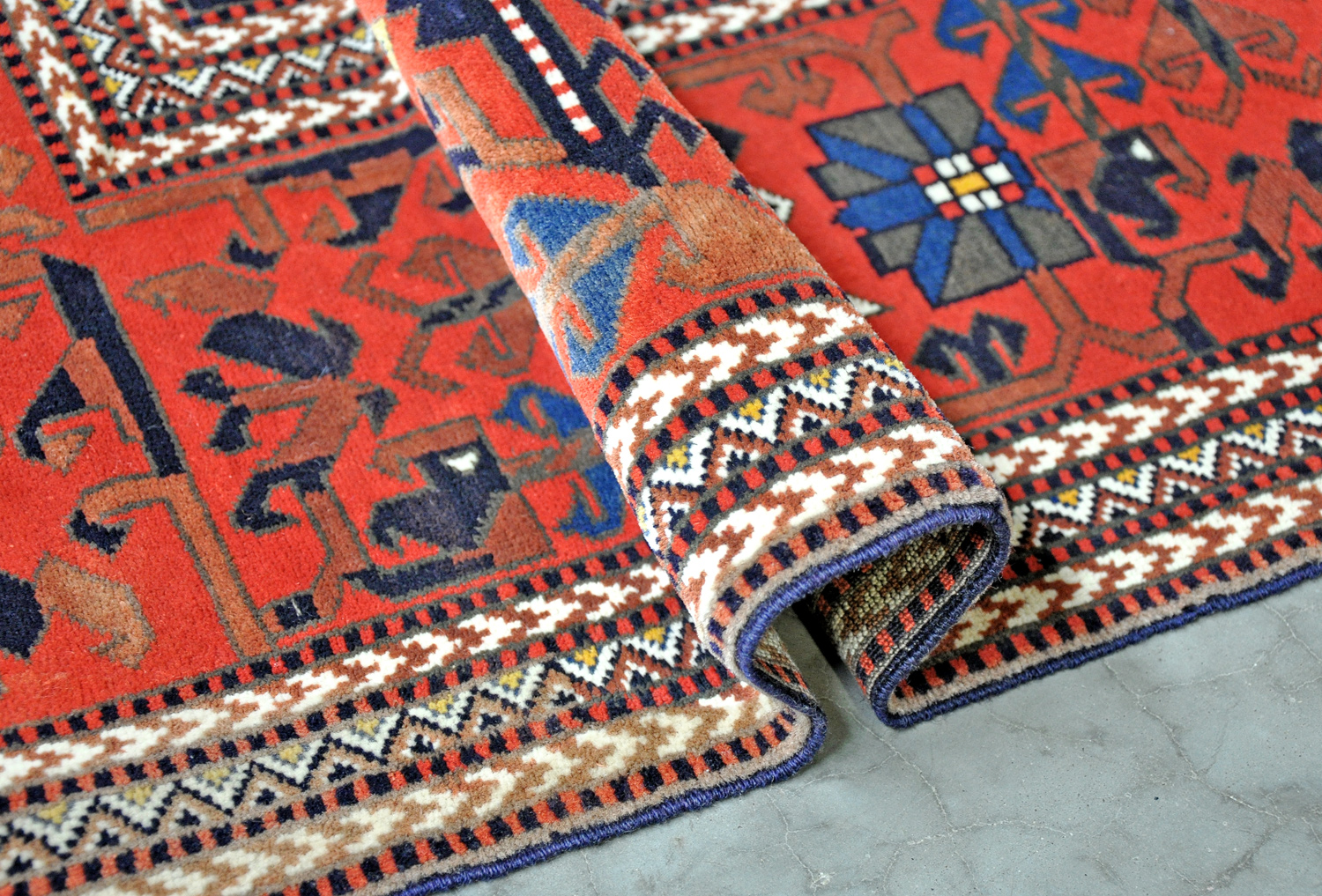 Es handelt sich hier um eine handgeknüpfte rostrote Pferdedecke mit dunkelbraunen, naturweißen und blauen Anteilen. Diese Decke zeichnen ausdrucksstarken Farben aus, ein sehr dekoratives Stück.
