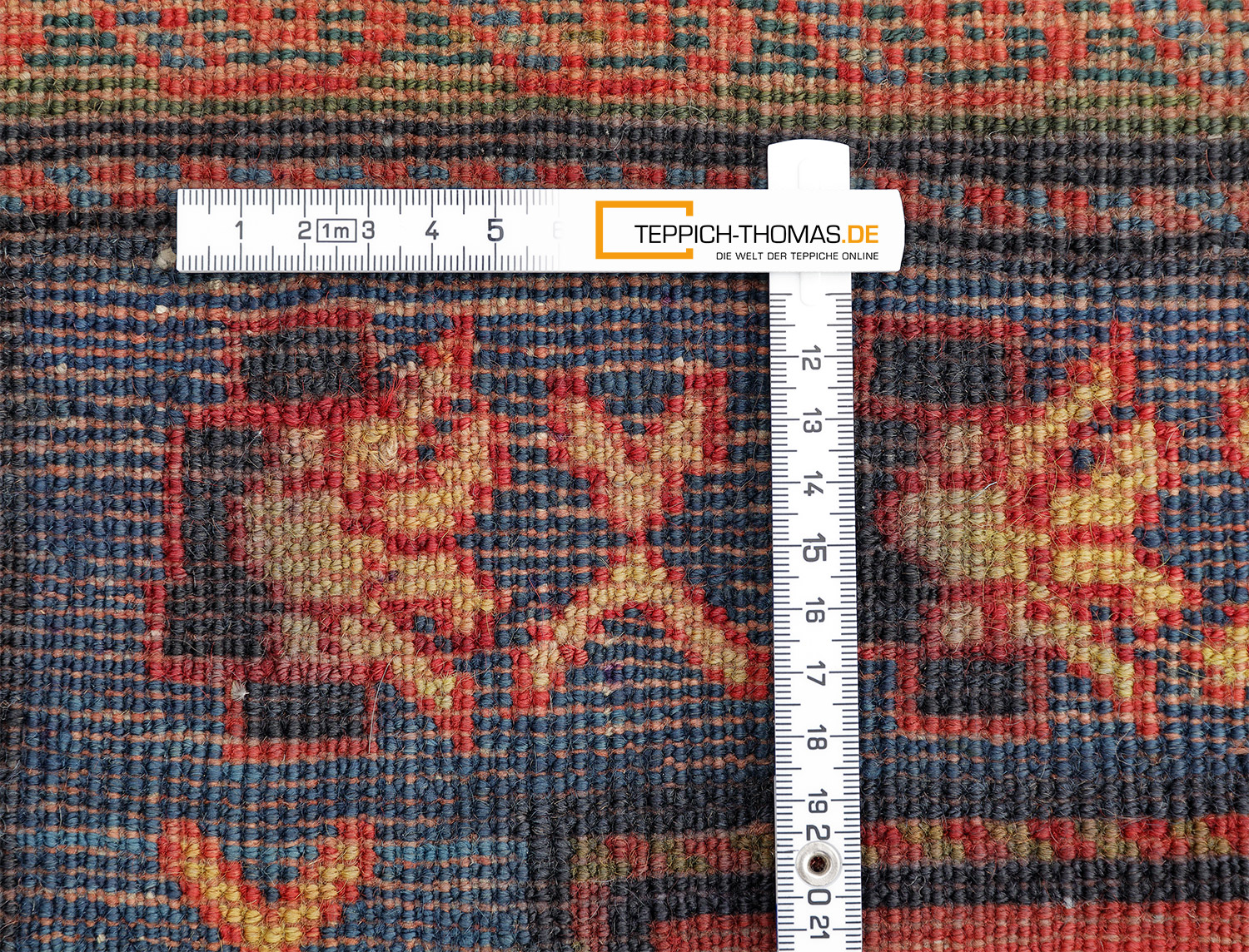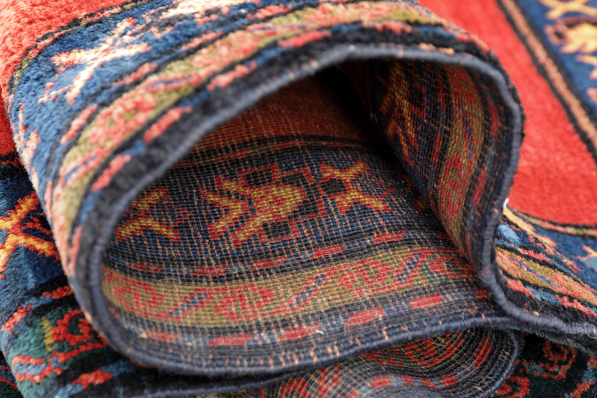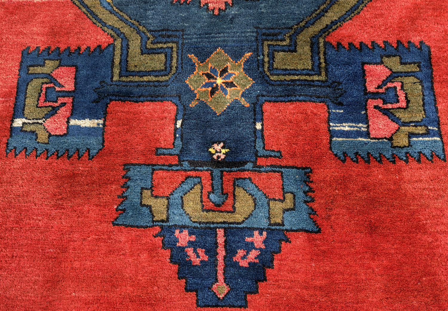 Ein monumentales Schildkrötenmotiv ziert den roten Fond des Innenfeldes dieses Kazak Teppichs. Die blaue Hauptbordüre ist mit einem geometrischen Musterrapport geschmückt. Dörfliche Knüpfarbeit kennzeichnen dieses Stück, es wurde mit reiner Schurwolle auf Wolle geknüpft. Verwendet wurden Pflanzenfarben.