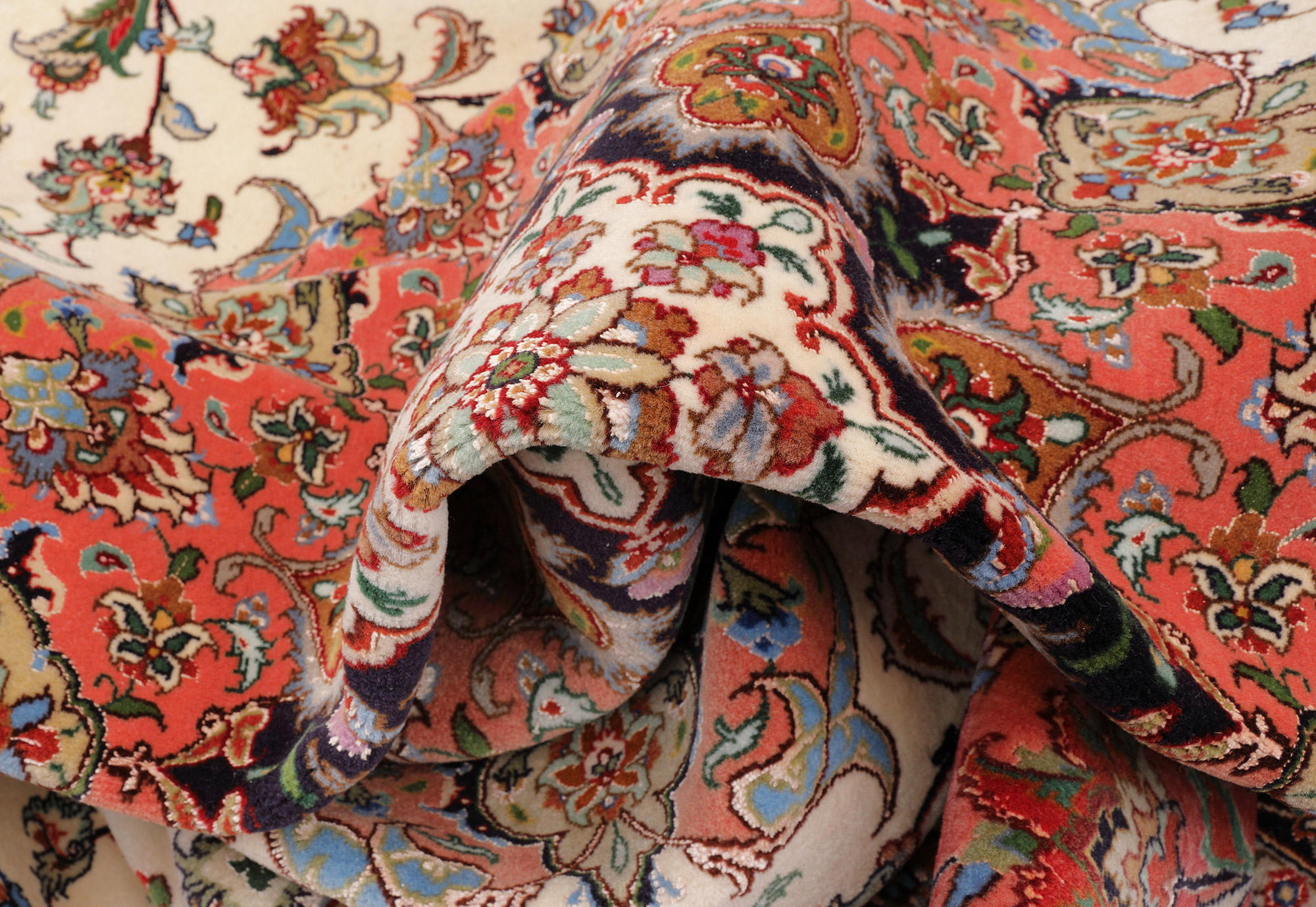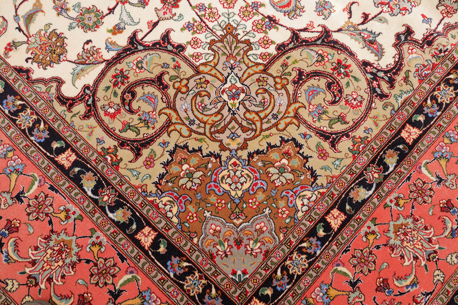 Kennzeichnend für diesen neuwertigen Täbriz Perserteppich ist das klassische florale, in beige gehaltene Muster sowie das zentrale Medaillon. Der Teppich hat eine Knüpfeinstellung von 50 Radj.