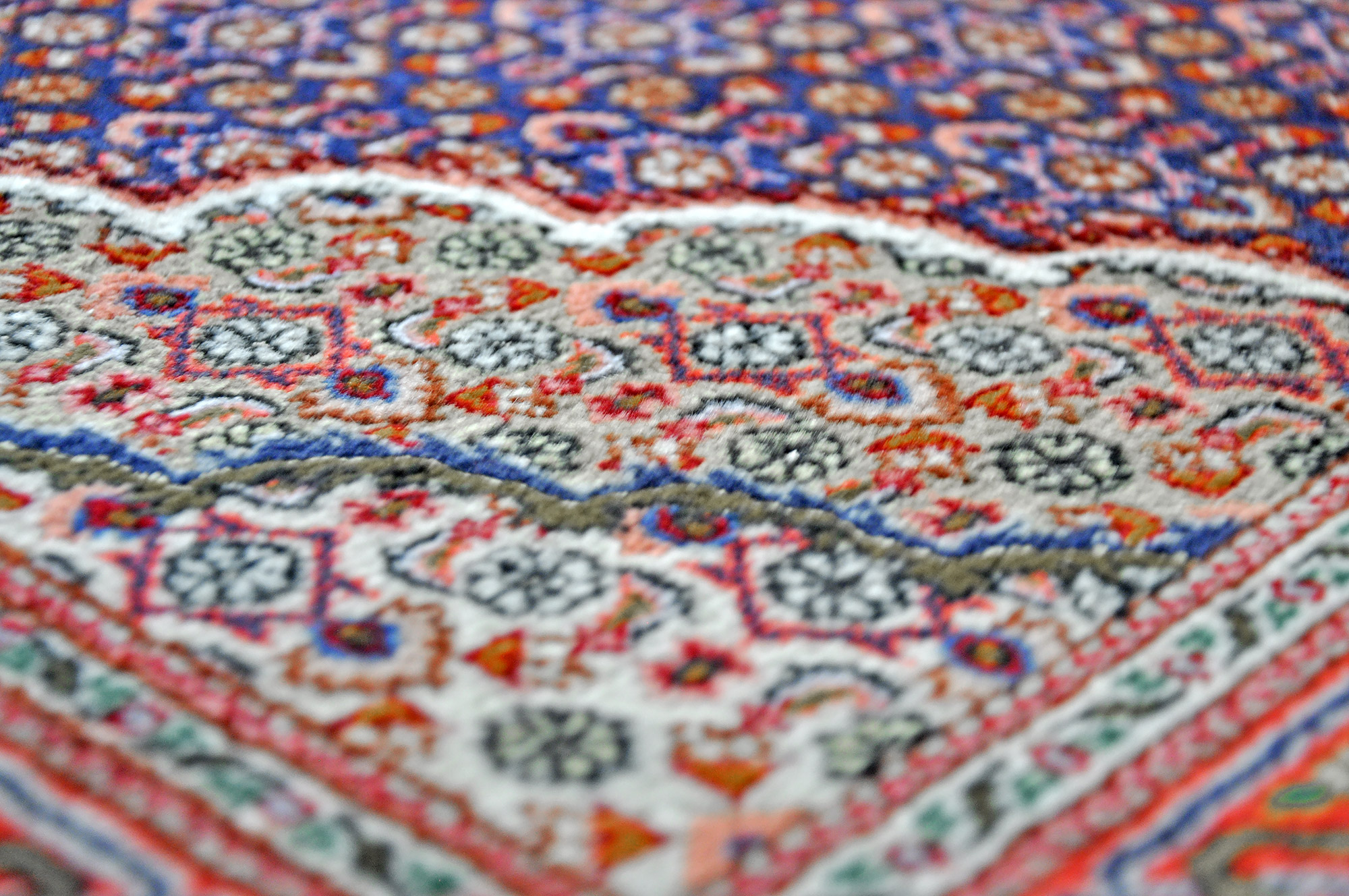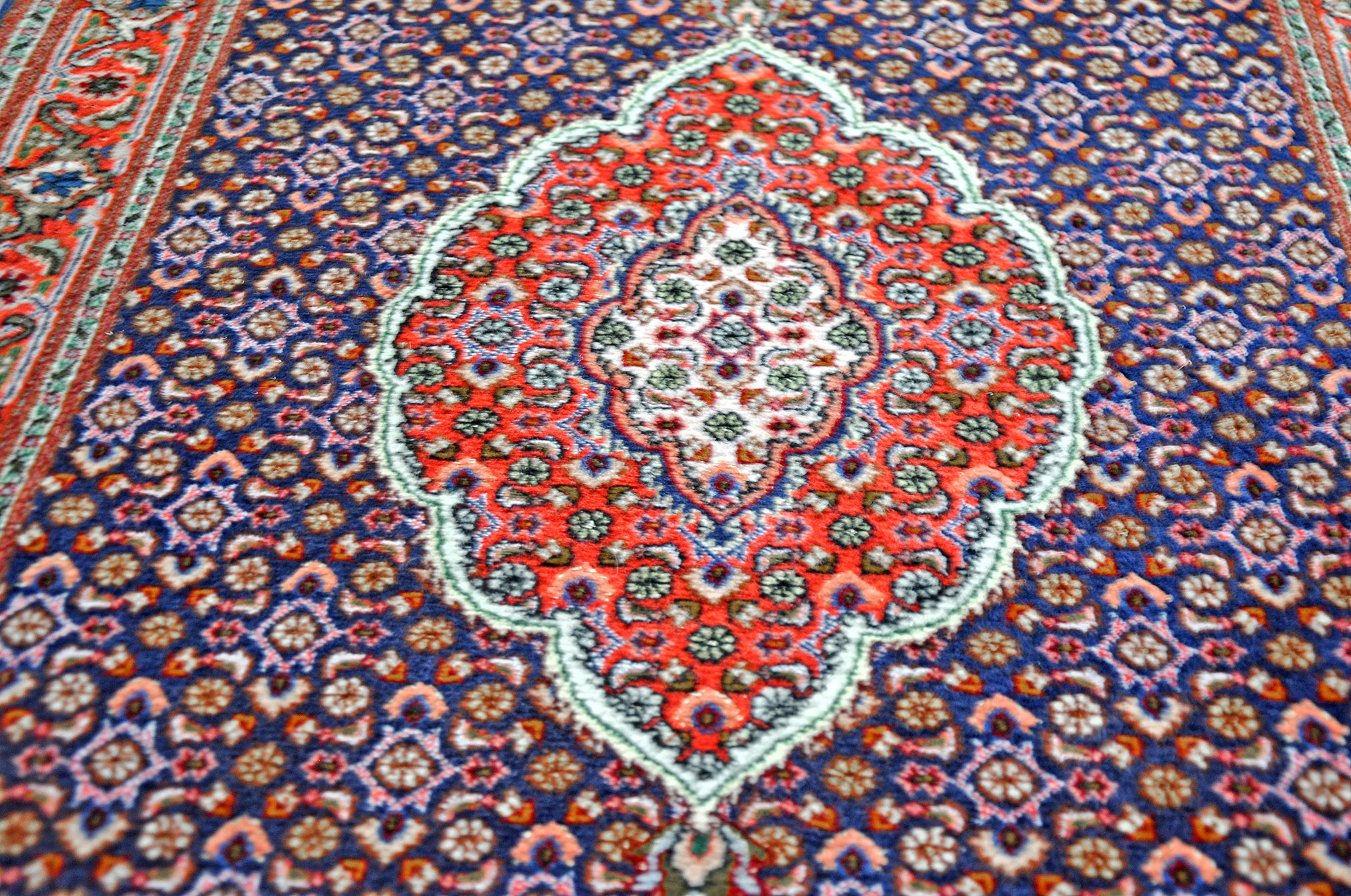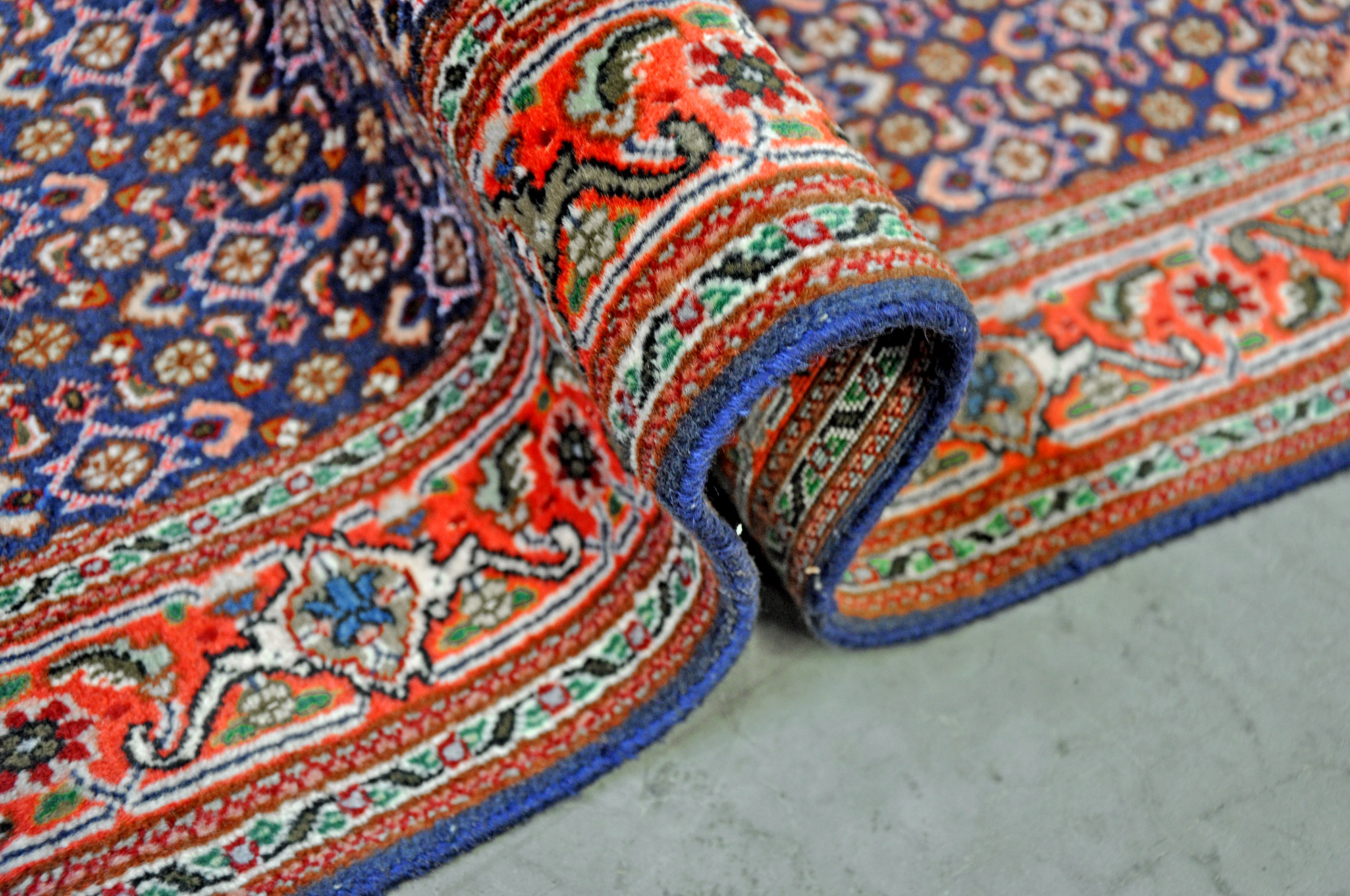 Sehr schöne Schurwolle sowie das typische Mahi-Muster in blau gehalten zeichnen diesen Perserteppich aus.