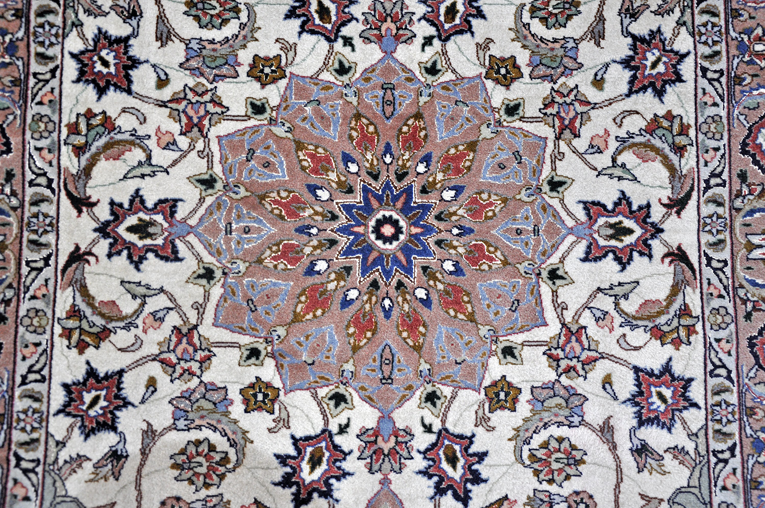 Hier handelt es sich um einen klassischen floral gemusterten Medaillonteppich. Der Täbris ist beigegrundig mit einer grün-bräunlichen Hauptbordüre. Ein sehr fein geknüpfter, mit Seide gearbeiteter Teppich.