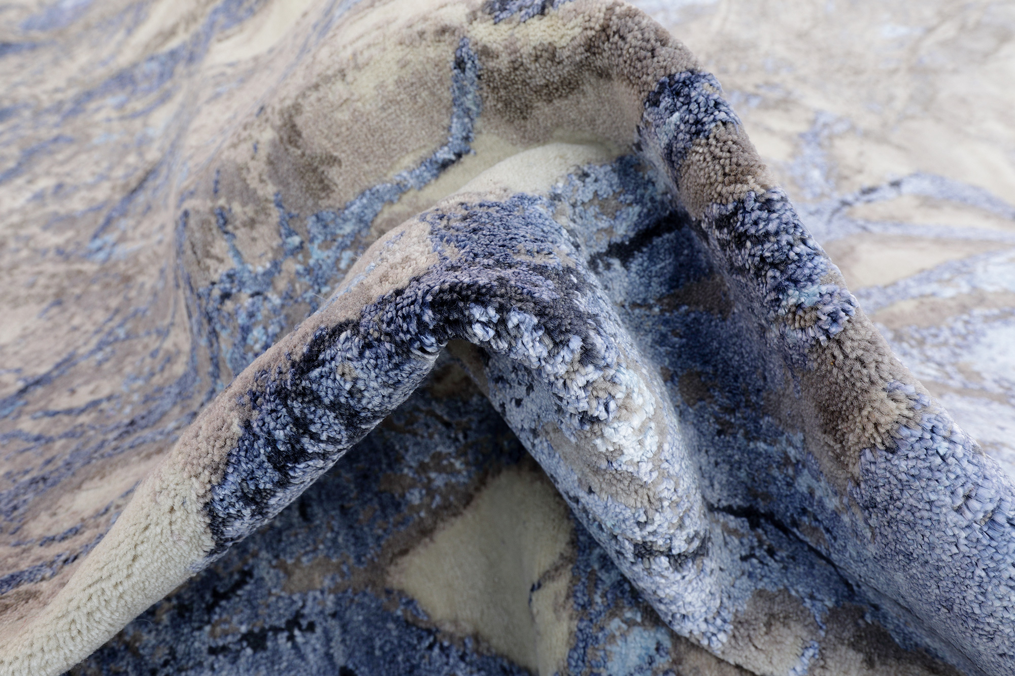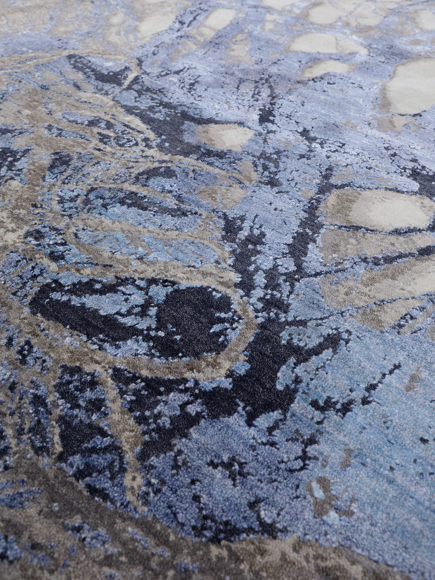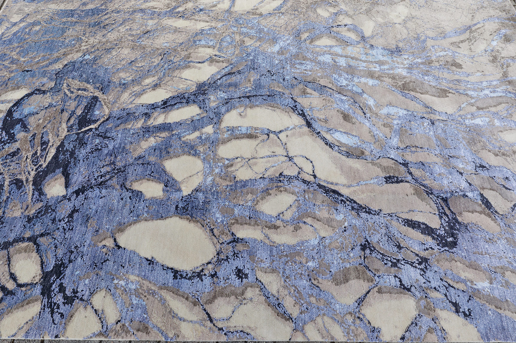 Ein origineller Designteppich aus Schurwolle und Bambusseide, handgeknüpft aus Indien mit einer Knotenzahl von 210.000 kn/qm.